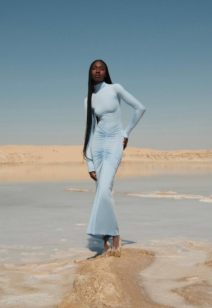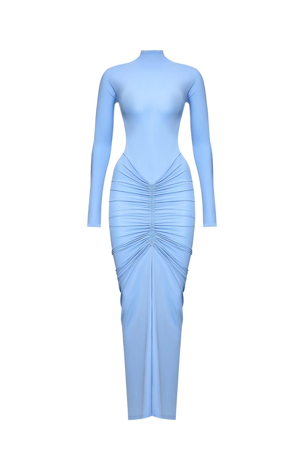 Облегающее платье длины макси с акцентной драпировкой и выразительным узлом на линии бёдер. Изделие выполнено из эластичного материала, который подчёркивает плавные линии силуэта. Встроенное боди дарит уверенность и комфорт при движении, обеспечивая идеальную посадку. Состав: 90% полиэстер, 10% спандекс.