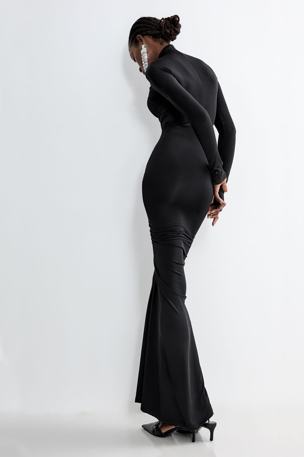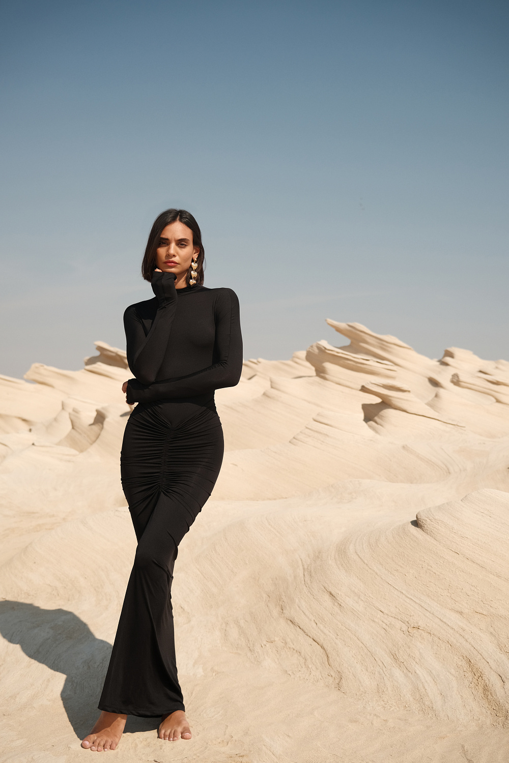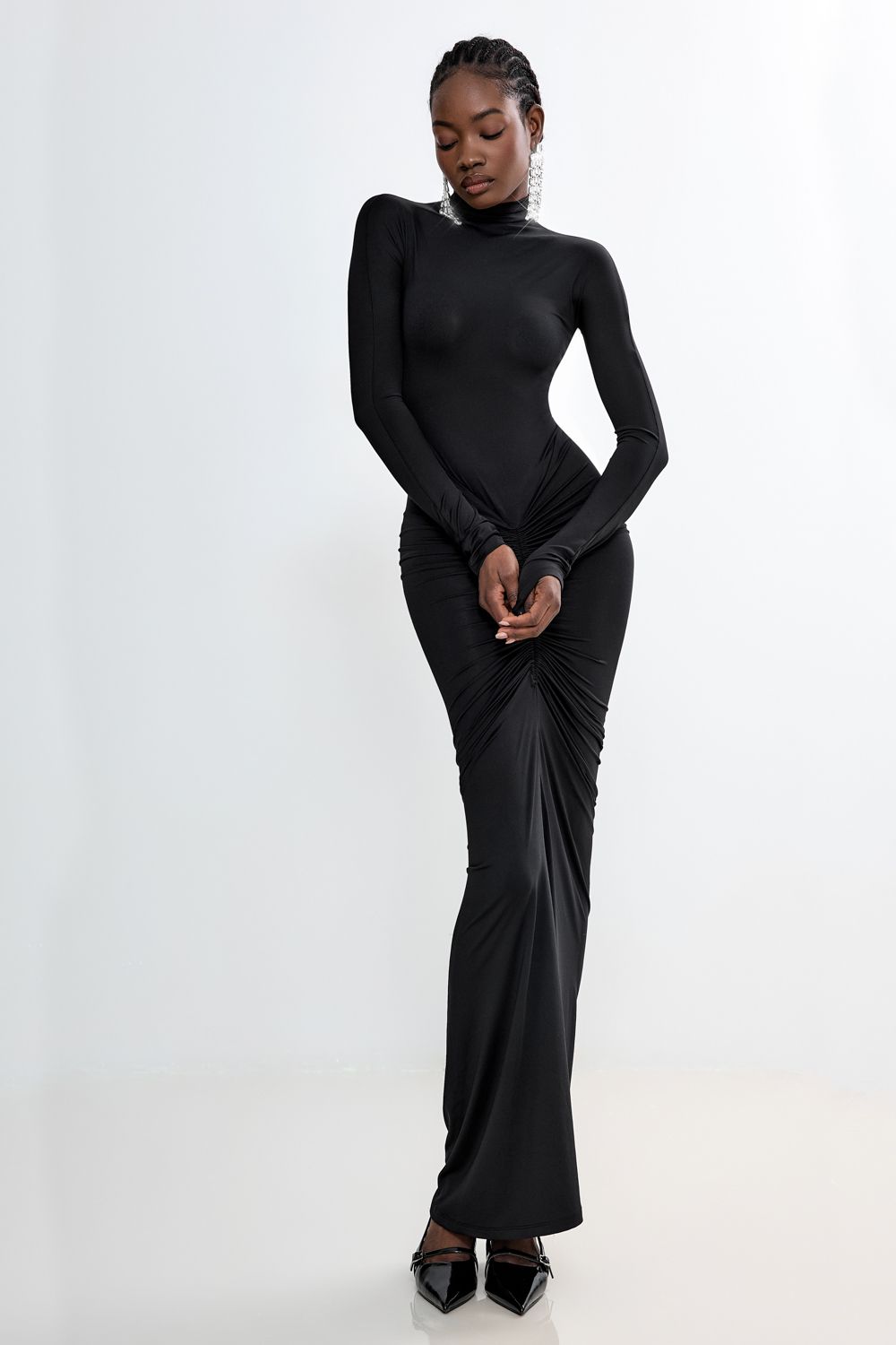 Облегающее платье длины макси с акцентной драпировкой и выразительным узлом на линии бёдер. Изделие выполнено из эластичного материала, который подчёркивает плавные линии силуэта. Встроенное боди дарит уверенность и комфорт при движении, обеспечивая идеальную посадку. Состав: 90% полиэстер, 10% спандекс.