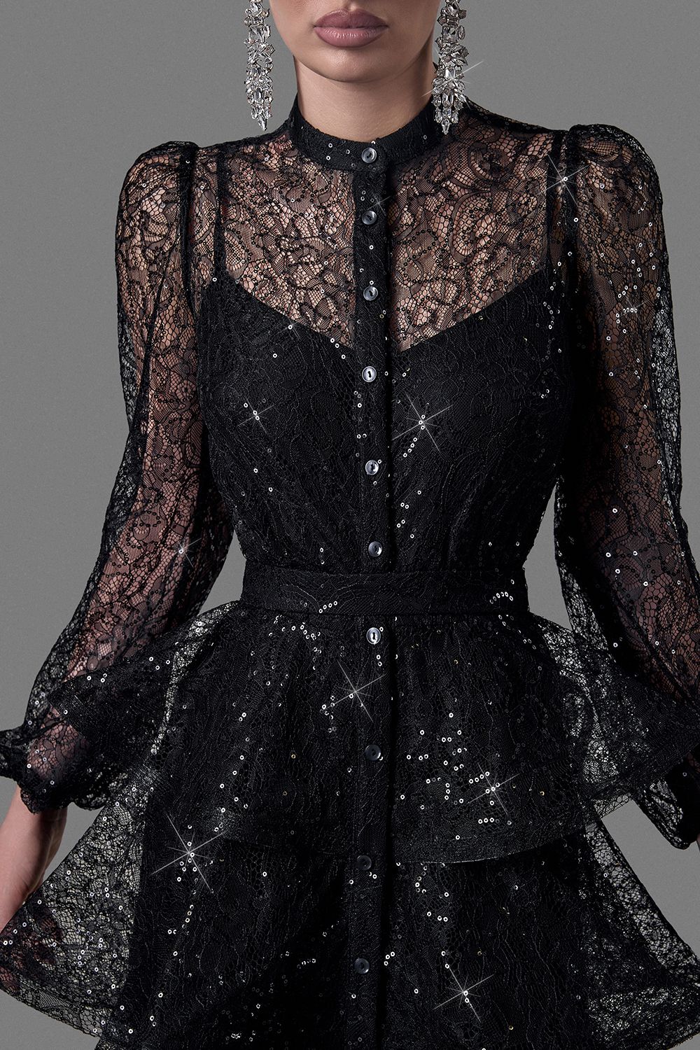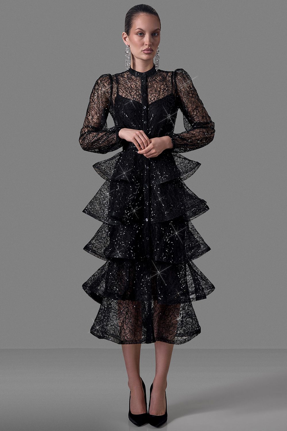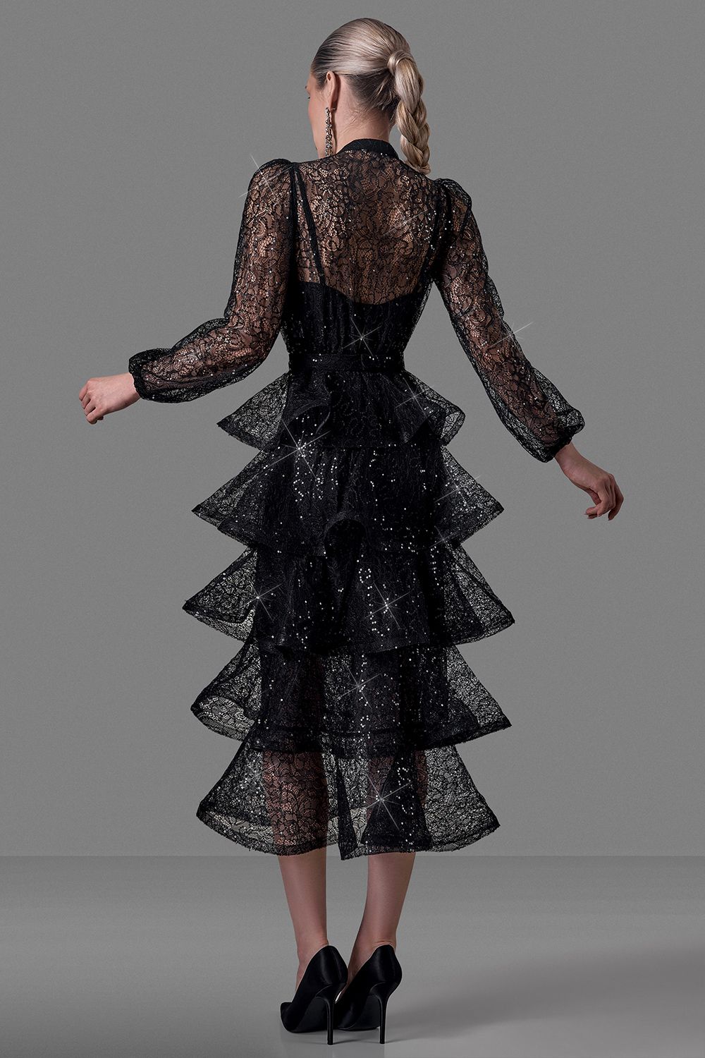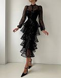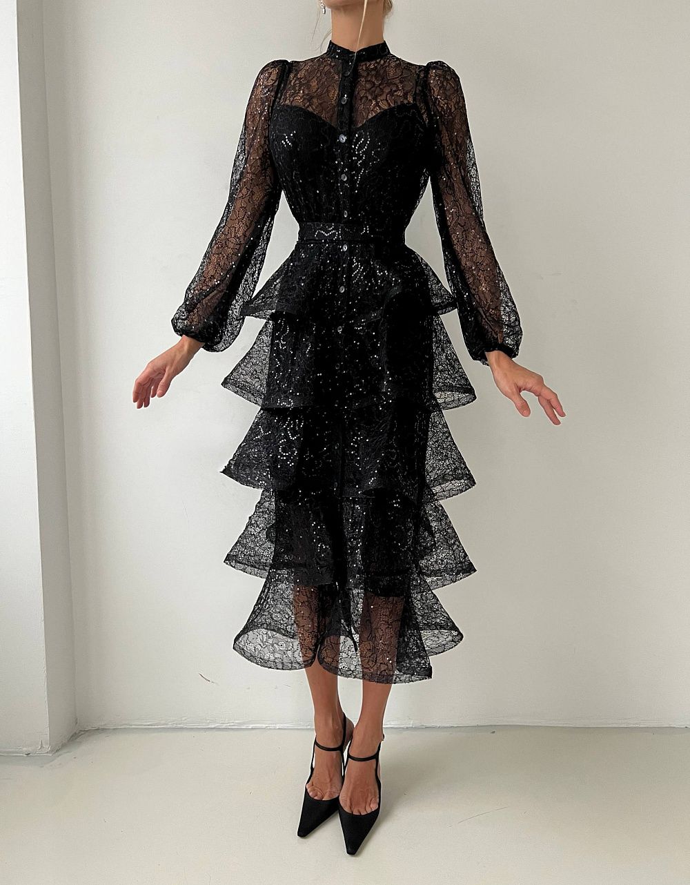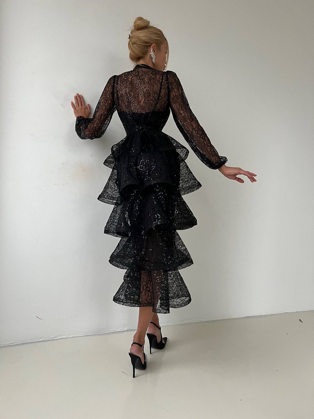 Элегантное платье, созданное для особых случаев. Выполнено из изящного кружева с легким блеском, которое эффектно отражает свет и подчеркивает глубину оттенка. Верхняя часть - полупрозрачная, с длинными воздушными рукавами и аккуратной застежкой на маленькие пуговицы, создающая утончённый и женственный силуэт. Длина изделия по спинке: 125 см. Длина рукава: 59 см. Состав: 100% нейлон
