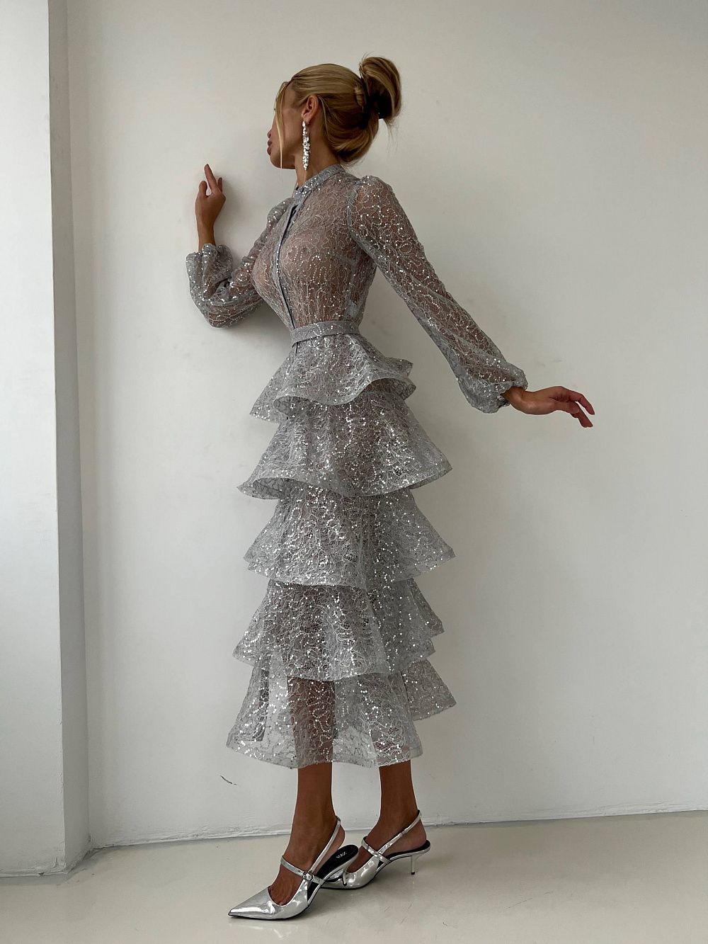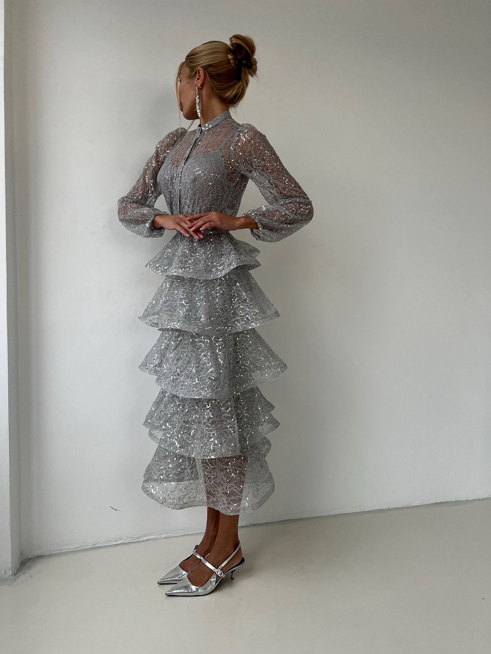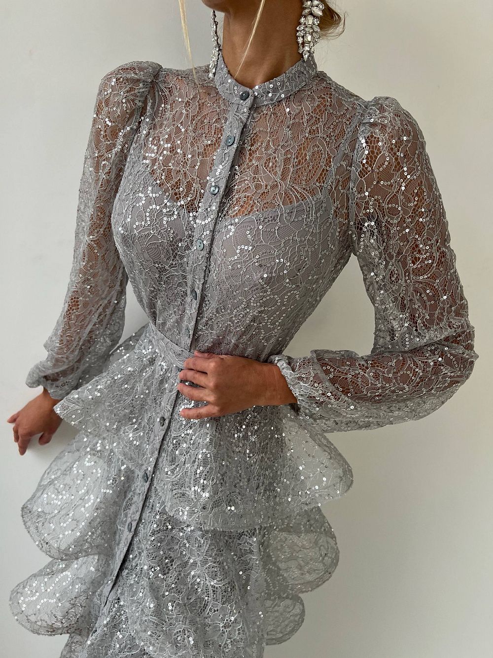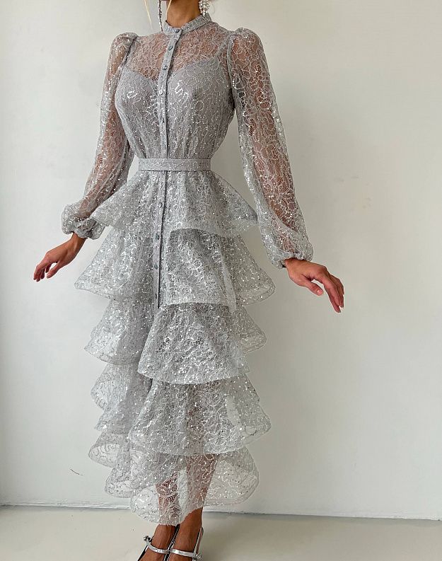 Элегантное платье, созданное для особых случаев. Выполнено из изящного кружева с легким блеском, которое эффектно отражает свет и подчеркивает глубину оттенка. Верхняя часть - полупрозрачная, с длинными воздушными рукавами и аккуратной застежкой на маленькие пуговицы, создающая утончённый и женственный силуэт. Длина изделия по спинке: 125 см. Длина рукава: 59 см. Состав: 100% нейлон