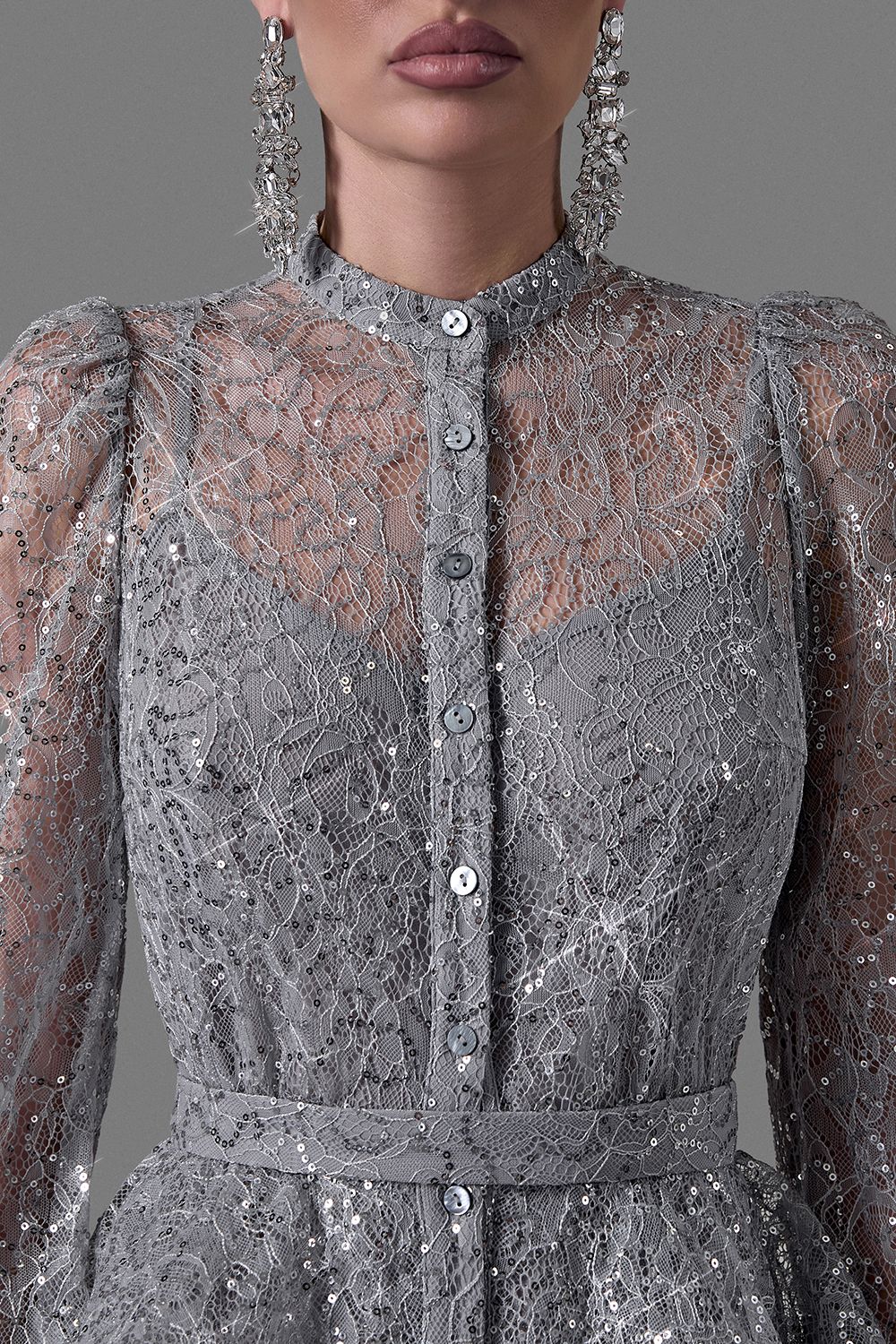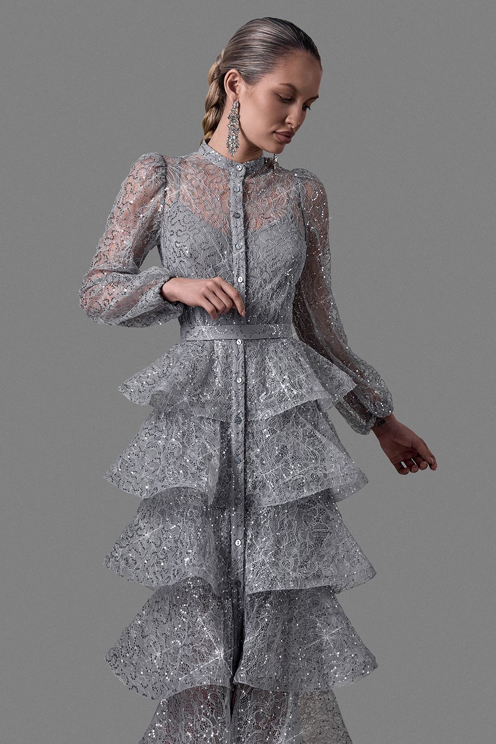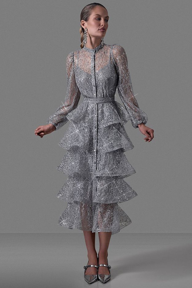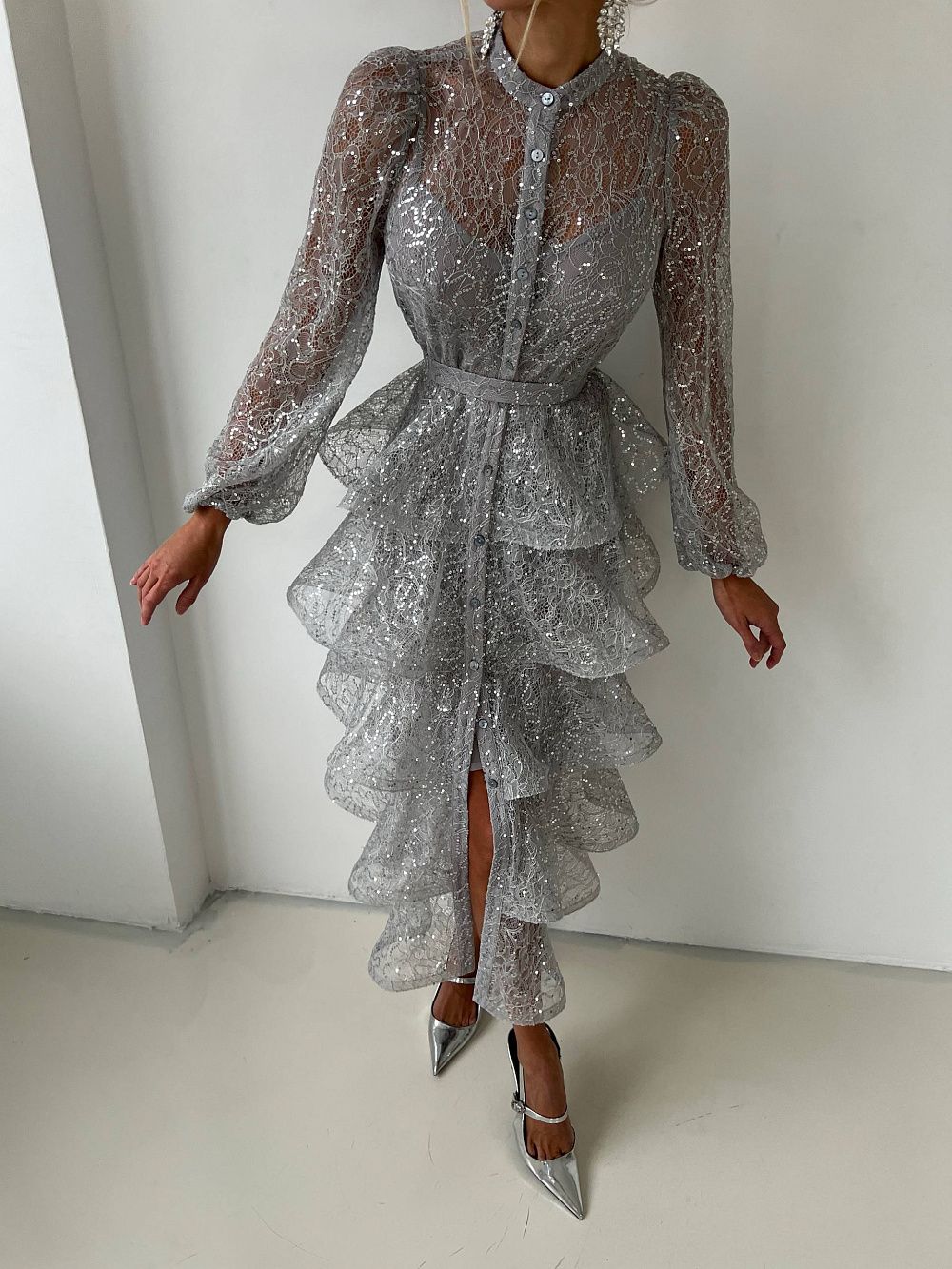 Элегантное платье, созданное для особых случаев. Выполнено из изящного кружева с легким блеском, которое эффектно отражает свет и подчеркивает глубину оттенка. Верхняя часть - полупрозрачная, с длинными воздушными рукавами и аккуратной застежкой на маленькие пуговицы, создающая утончённый и женственный силуэт. Длина изделия по спинке: 125 см. Длина рукава: 59 см. Состав: 100% нейлон