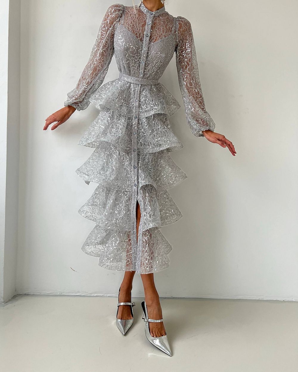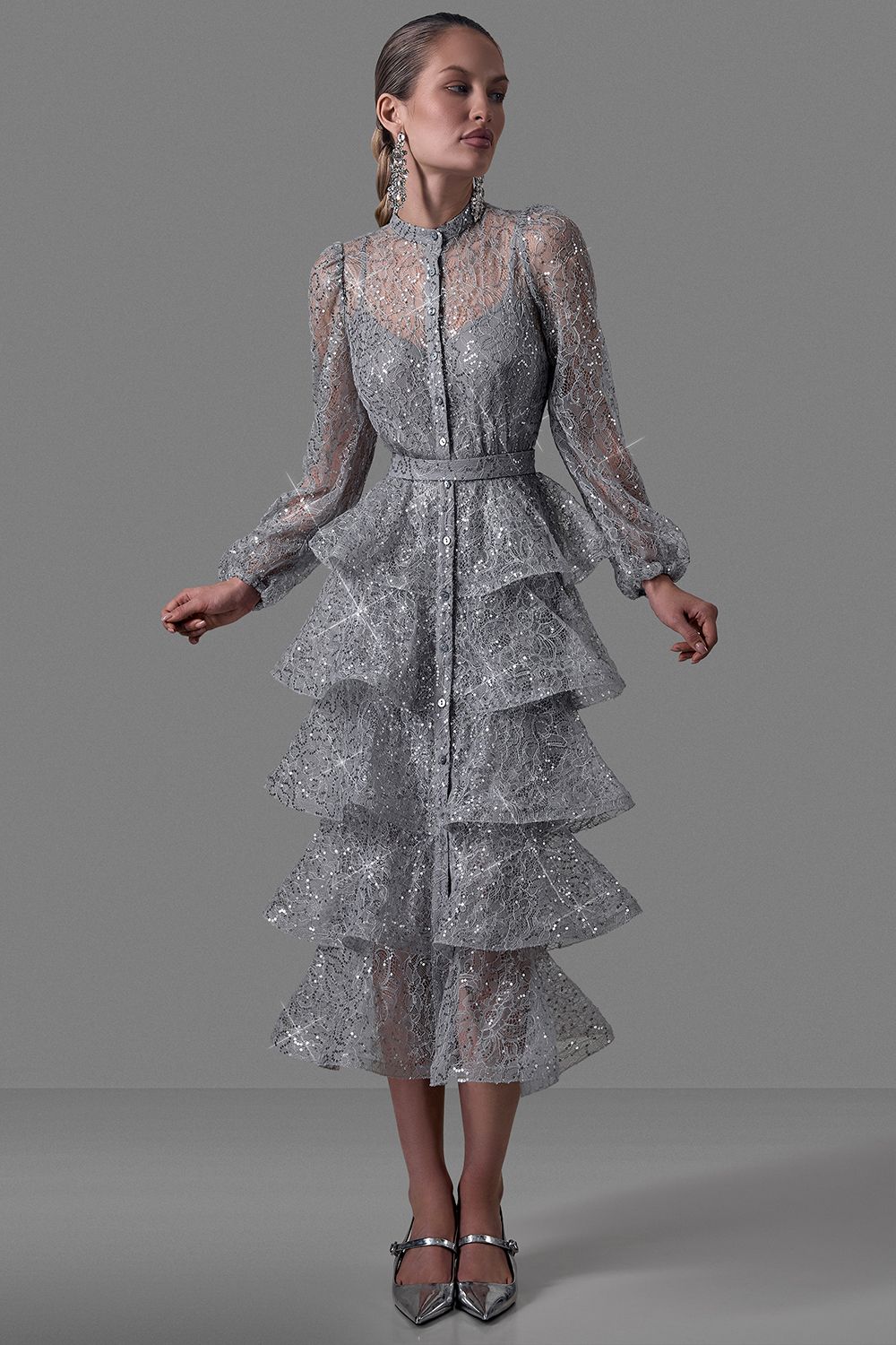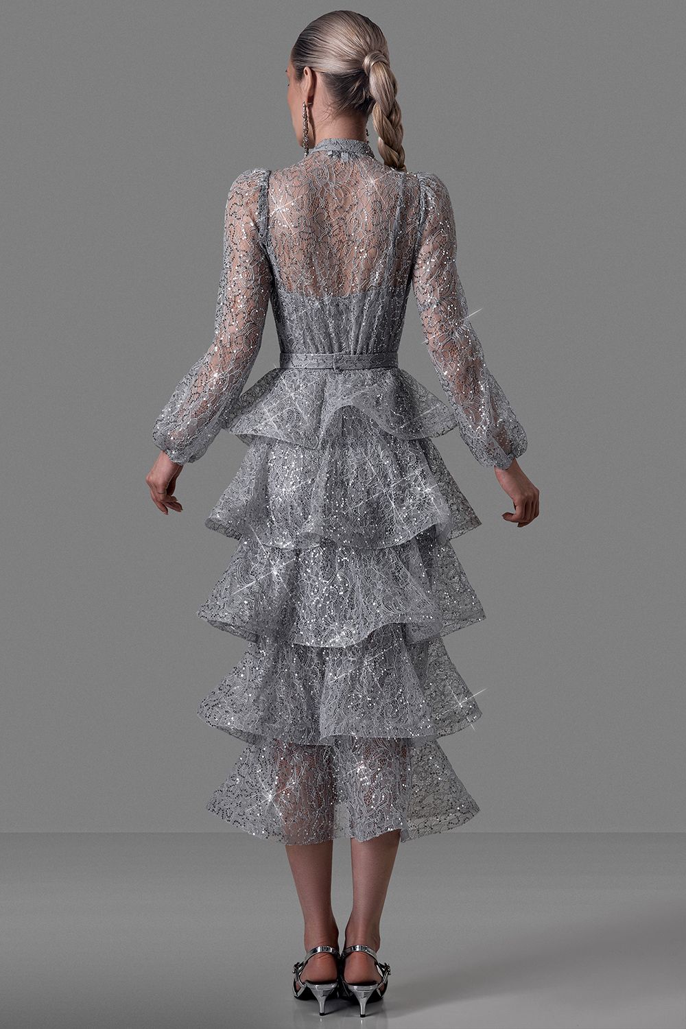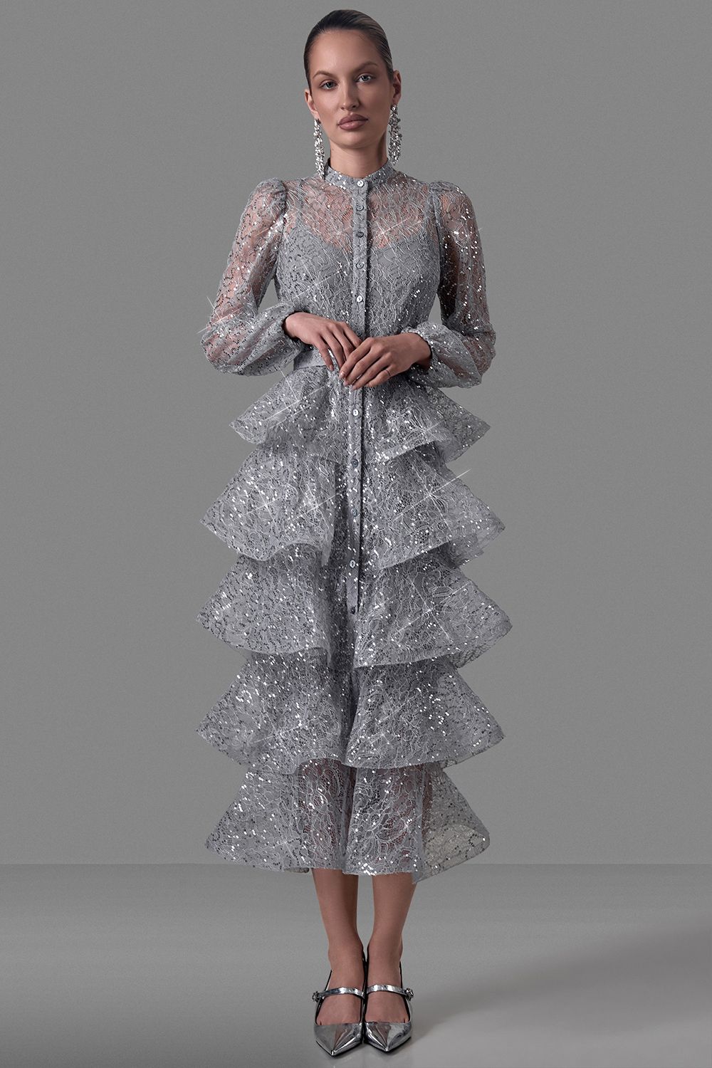 Элегантное платье, созданное для особых случаев. Выполнено из изящного кружева с легким блеском, которое эффектно отражает свет и подчеркивает глубину оттенка. Верхняя часть - полупрозрачная, с длинными воздушными рукавами и аккуратной застежкой на маленькие пуговицы, создающая утончённый и женственный силуэт. Длина изделия по спинке: 125 см. Длина рукава: 59 см. Состав: 100% нейлон