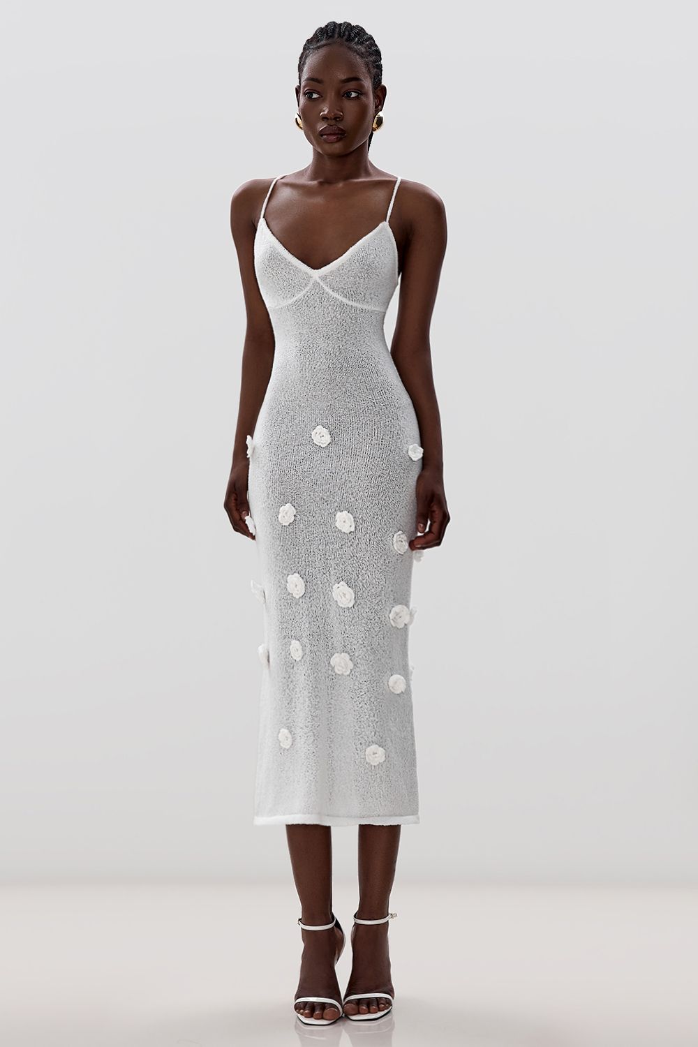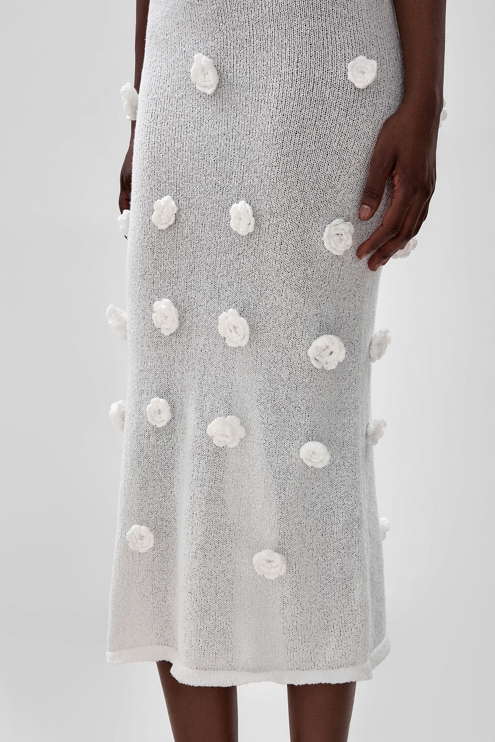 Облегающее платье средней длины (миди), плавно повторяющее линии фигуры. Лиф на тонких бретелях с глубоким вырезом в форме сердечка, подчеркивающий изящество плеч и ключиц. По всей длине платья размещены объемные декоративные элементы в виде цветочных аппликаций. Длина по боковому шву 126 см. Состав: 100% полиэстер
