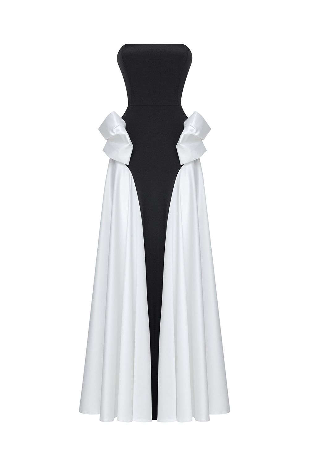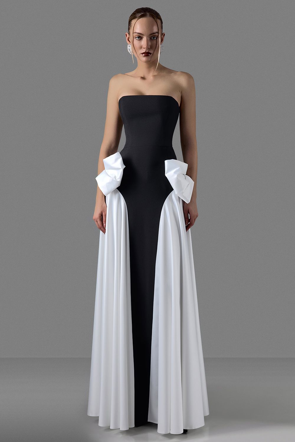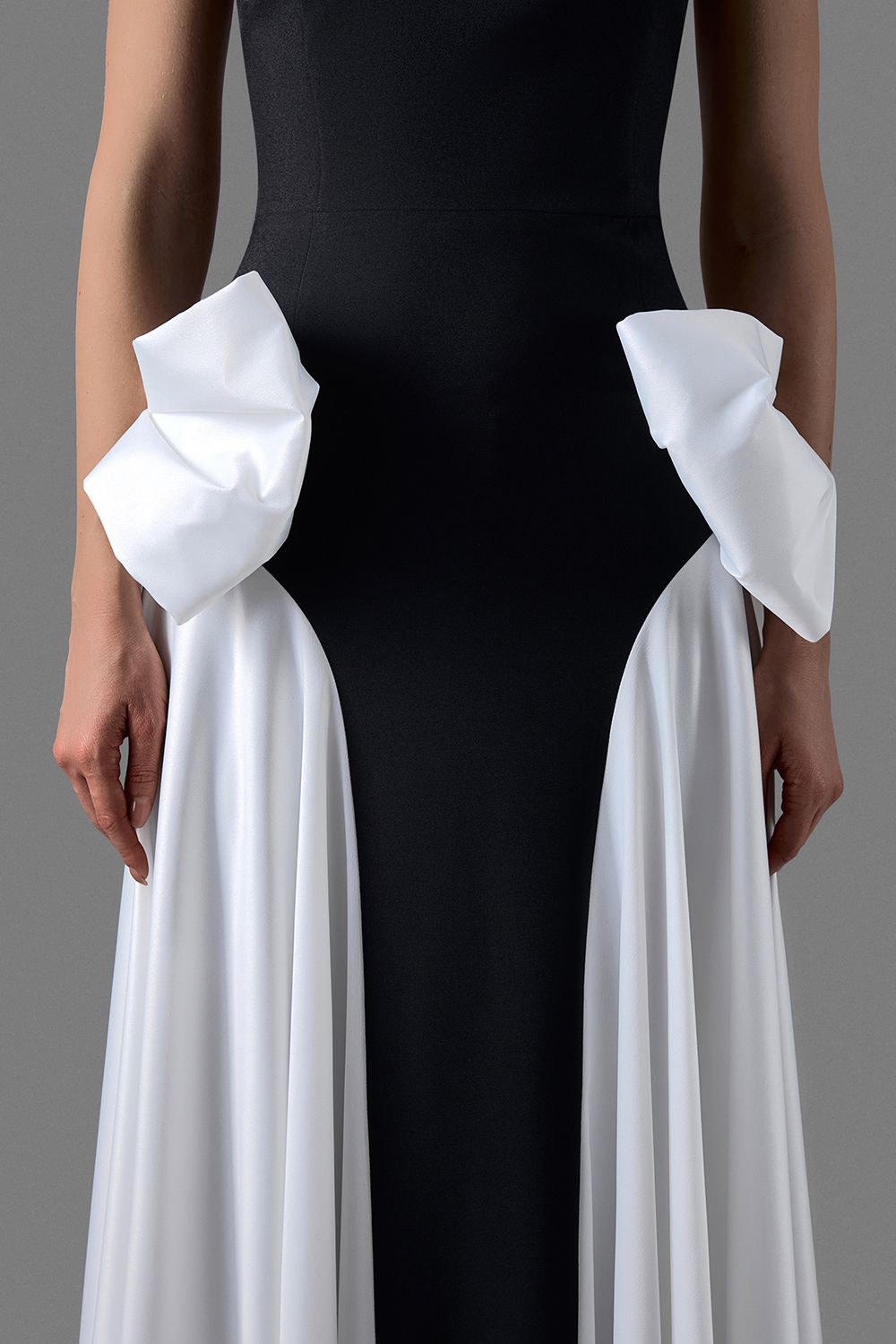 Эффектное вечернее платье с архитектурным силуэтом. Верх выполнен в виде лаконичного бюстье, подчеркивающего линию плеч и декольте. Основная часть - из плотного материала, визуально стройнящего фигуру. Контрастные вставки из мягкой ткани создают изысканное движение при ходьбе. Ключевой акцент - крупные декоративные банты по бокам, придающие образу графичность и couture-настроение. Состав: 95% полиэстер, 5% спандекс, Подкладка 95% полиэстер, 5% эластан.