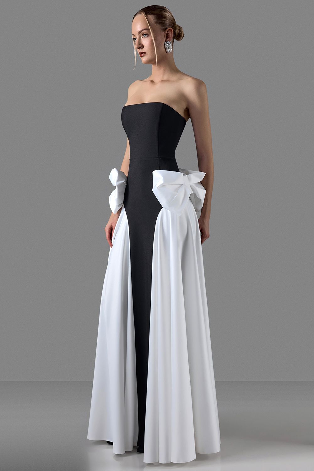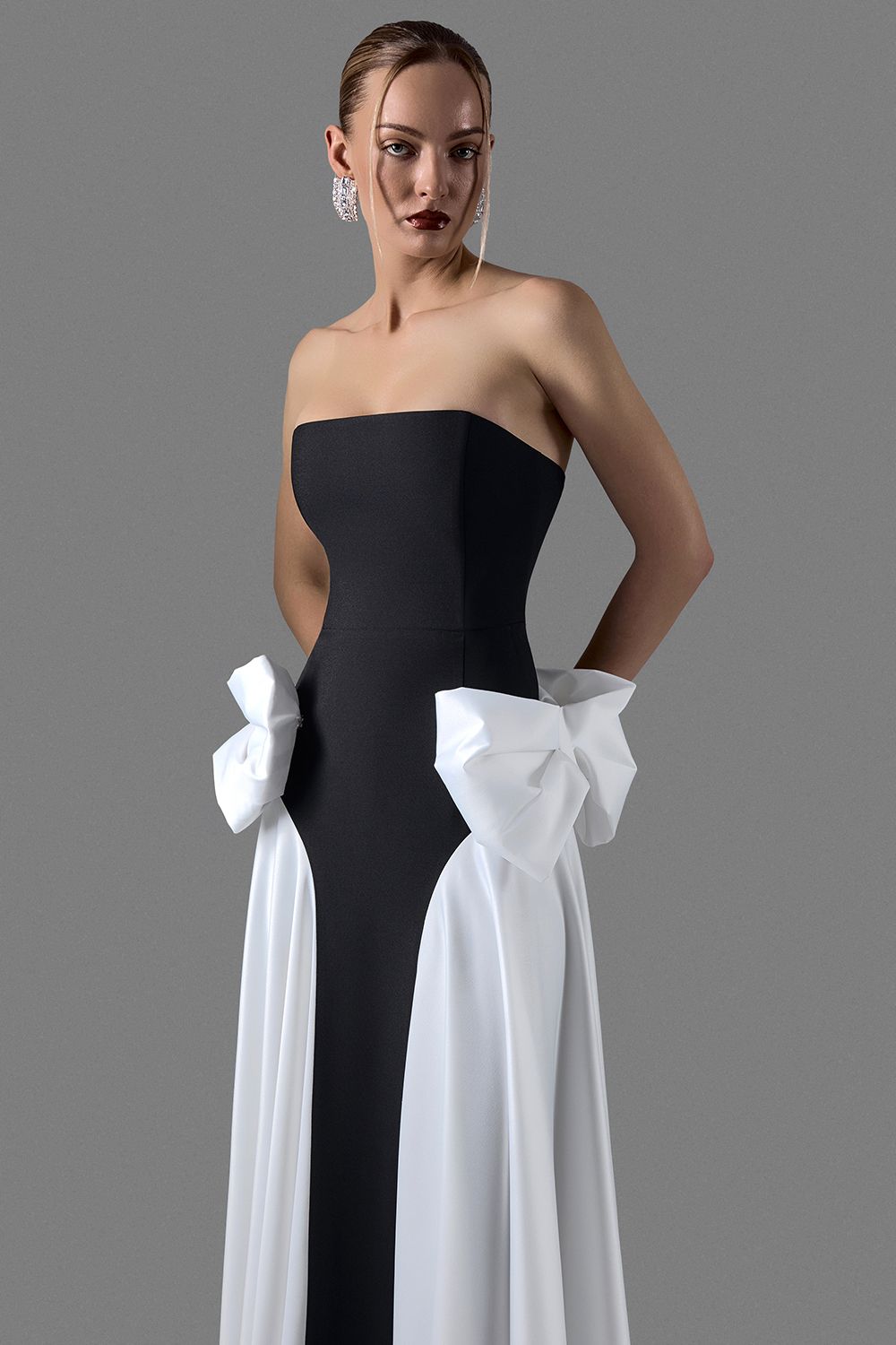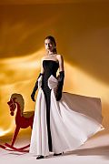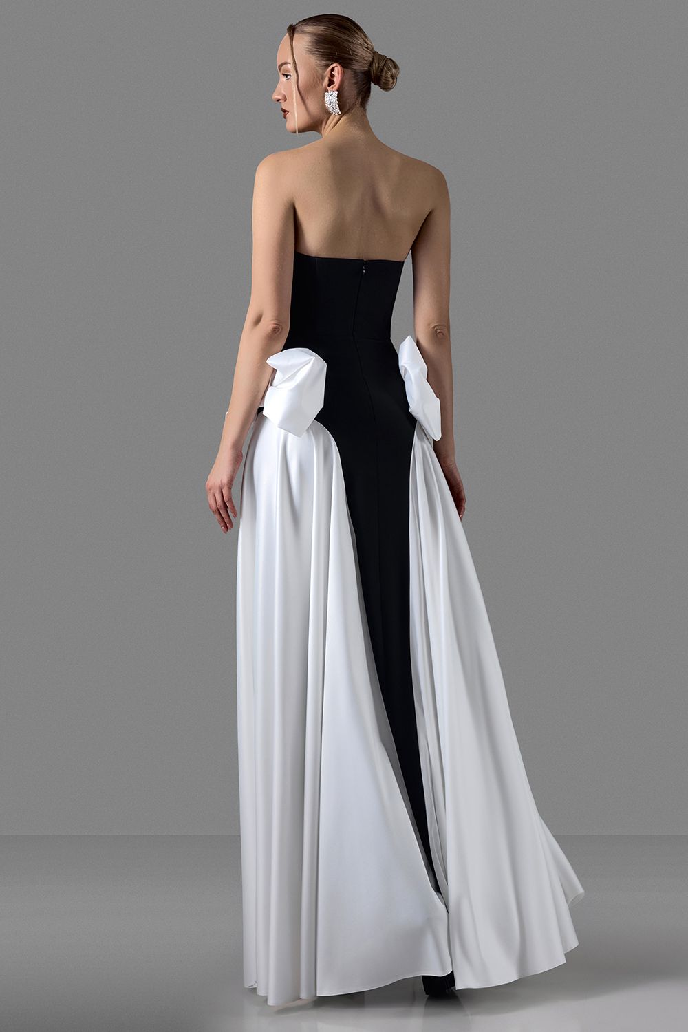Эффектное вечернее платье с архитектурным силуэтом. Верх выполнен в виде лаконичного бюстье, подчеркивающего линию плеч и декольте. Основная часть - из плотного материала, визуально стройнящего фигуру. Контрастные вставки из мягкой ткани создают изысканное движение при ходьбе. Ключевой акцент - крупные декоративные банты по бокам, придающие образу графичность и couture-настроение. Состав: 95% полиэстер, 5% спандекс, Подкладка 95% полиэстер, 5% эластан.
