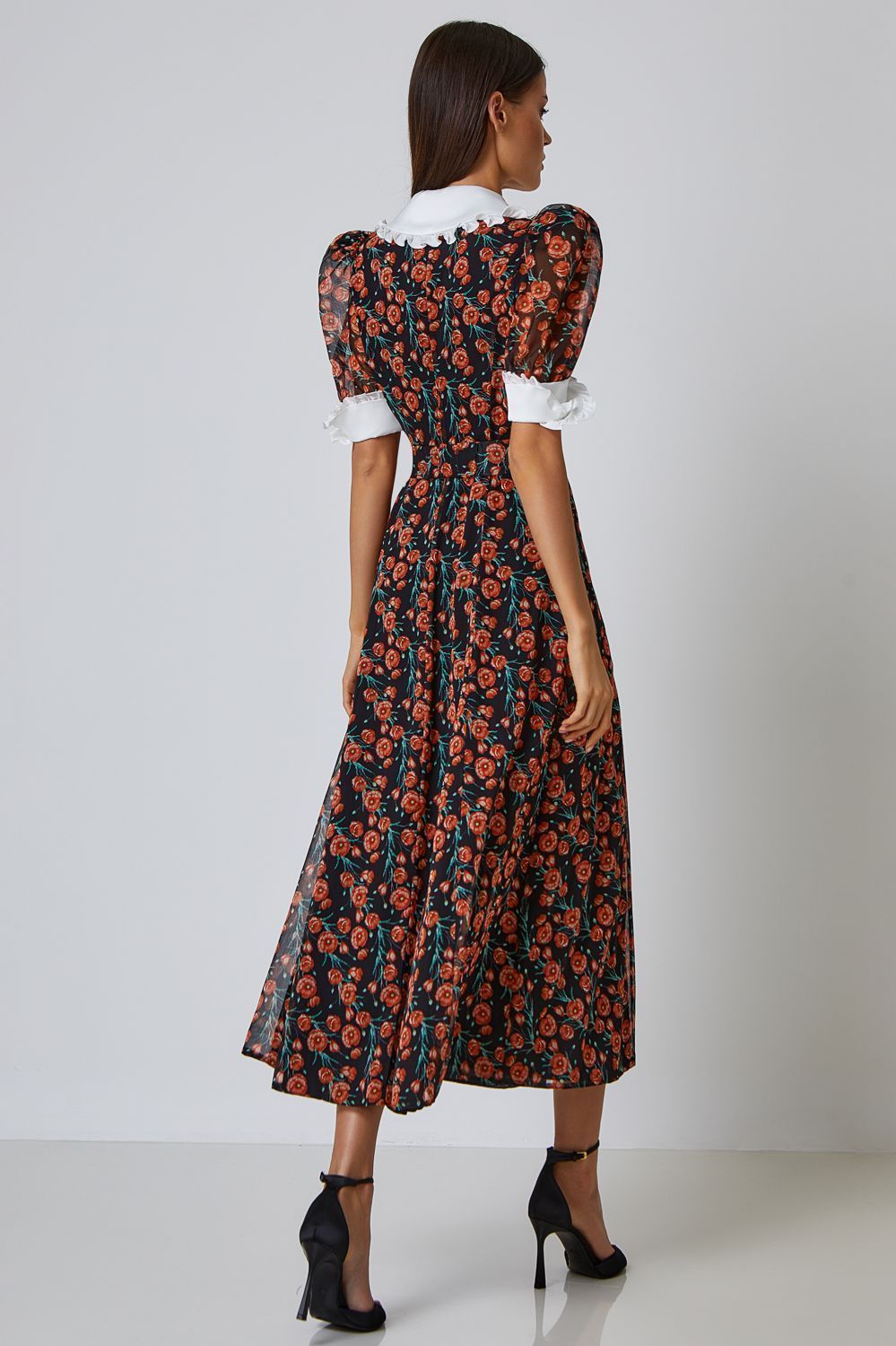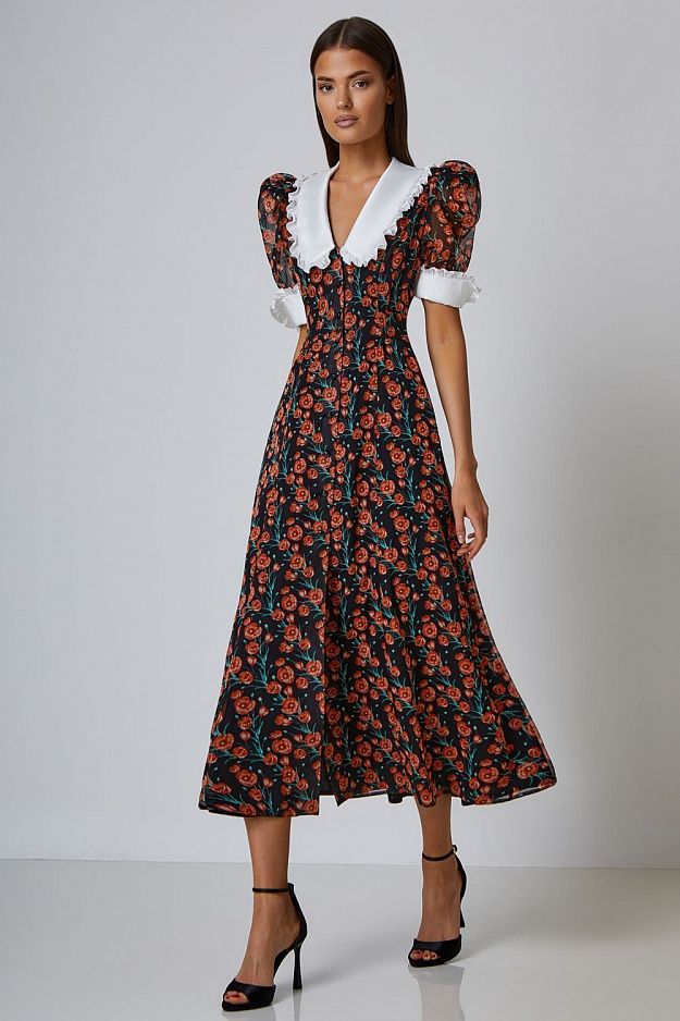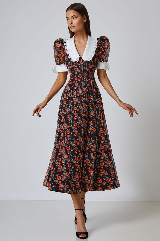 Платье с авторским цветочным принтом - утончённая модель, в которой сочетаются женственность и выразительный дизайн. Приталенный силуэт подчёркивает фигуру, а мягкая линия юбки создаёт лёгкое, плавное движение при каждом шаге. Акцентный воротник с контрастной отделкой и объёмные рукава добавляют образу романтичности и делают модель по-настоящему запоминающейся. Авторский принт придаёт изделию уникальность - такой рисунок не повторяется и делает платье особенным в вашем гардеробе. Идеально подойдёт как для повседневных образов, так и для особых случаев, когда хочется выглядеть элегантно и небанально. Состав: 100% полиэстер, подкладка 95% полиэстер, 5% эластан