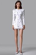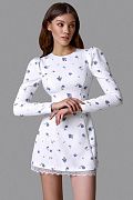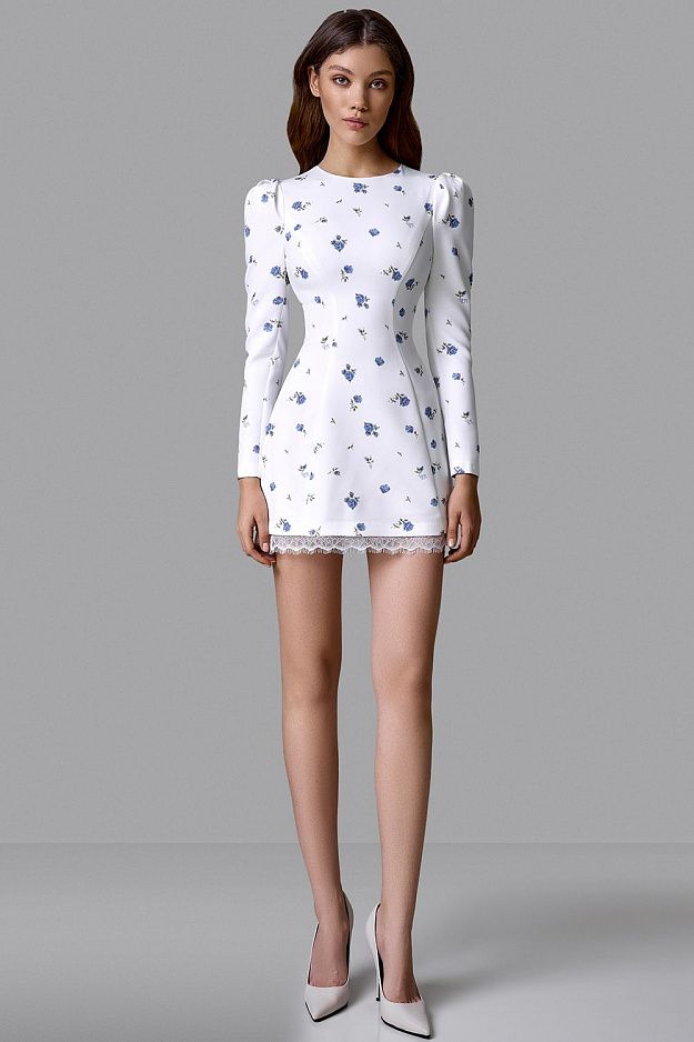 Короткое платье прилегающего кроя с акцентом на талии. Модель выполнена из плотной ткани, хорошо держащей форму. Декорировано эксклюзивным мелким цветочным принтом. Низ дополнен кружевной отделкой. Состав: 71% полиэстер, 23% вискоза, 6% эластан, Подклад 95% полиэстер 5% эластан