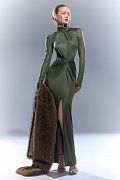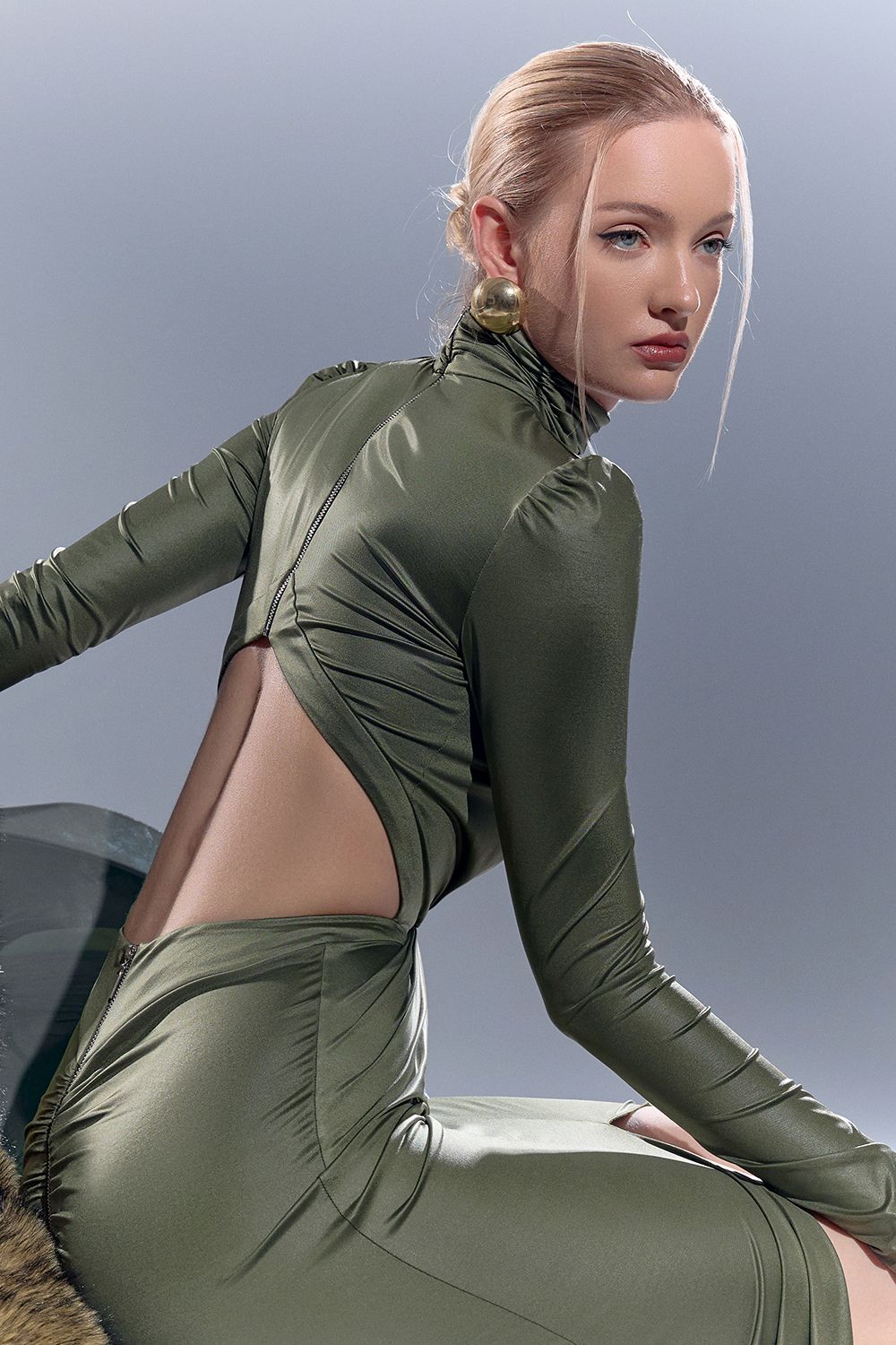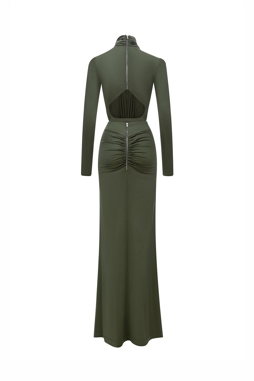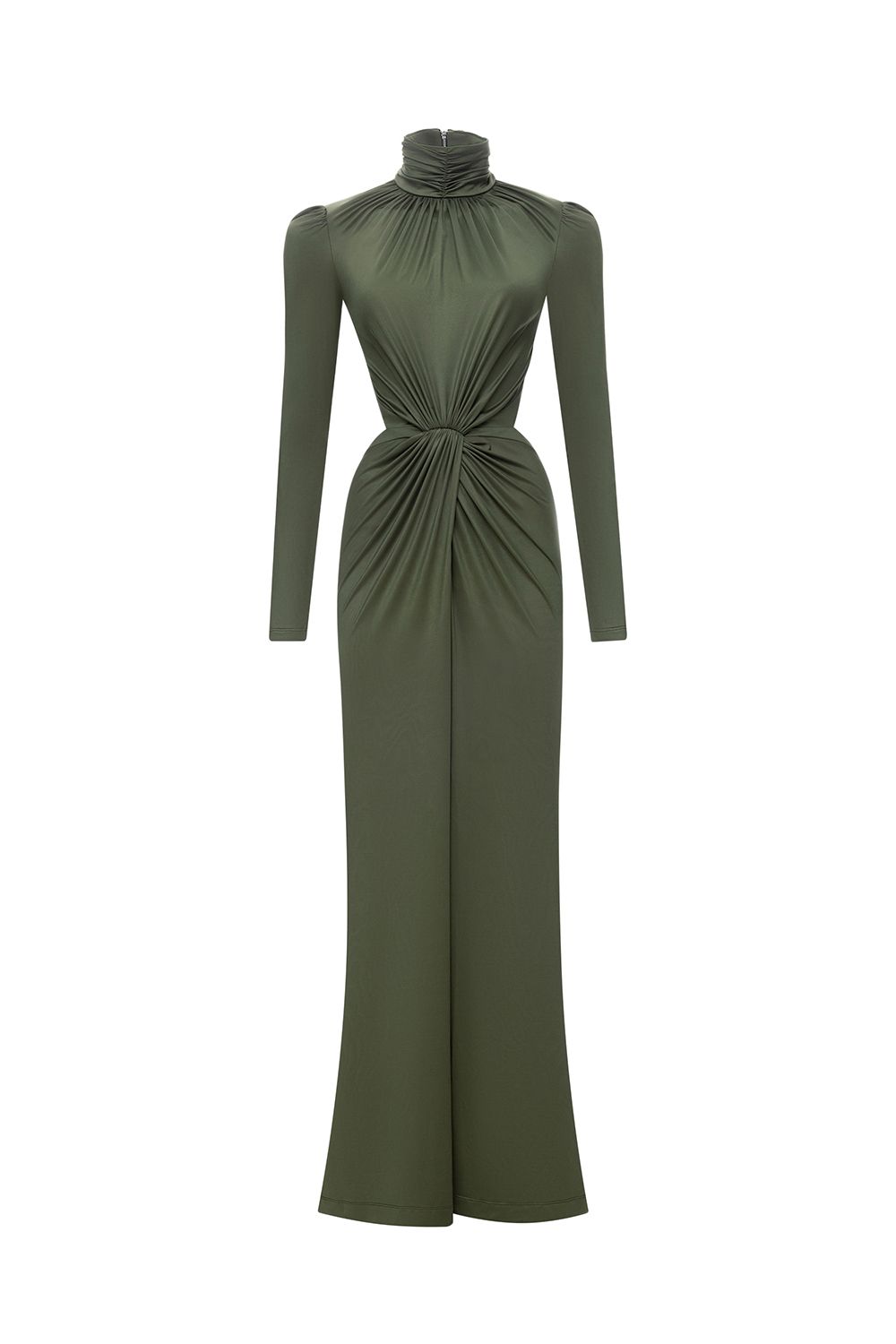 Элегантное вечернее платье из плотного эластичного материала, идеально подчеркивающее силуэт. Модель с высоким воротом и длинными рукавами создаёт утончённый, графичный образ. Эффектная драпировка на талии формирует акцент и визуально вытягивает фигуру, а смелый разрез спереди добавляет чувственности. Открытая спина с фигурным вырезом и молнией по центру придаёт образу современную сексуальность. Состав: 93% полиэстер, 7% спандекс