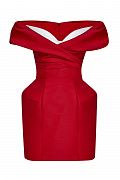 Эффектное мини-платье, созданное для особых выходов. Модель подчеркивает линию плеч и декольте за счёт мягко спущенного, драпированного верха, который открывает бюстье контрастного белого цвета - чистый акцент, добавляющий образу архитектурности и смелости. Силуэт приталенный, с акцентированной линией талии и объемной юбкой-тюльпаном, формирующей скульптурный контур.