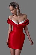 Эффектное мини-платье, созданное для особых выходов. Модель подчеркивает линию плеч и декольте за счёт мягко спущенного, драпированного верха, который открывает бюстье контрастного белого цвета - чистый акцент, добавляющий образу архитектурности и смелости. Силуэт приталенный, с акцентированной линией талии и объемной юбкой-тюльпаном, формирующей скульптурный контур.