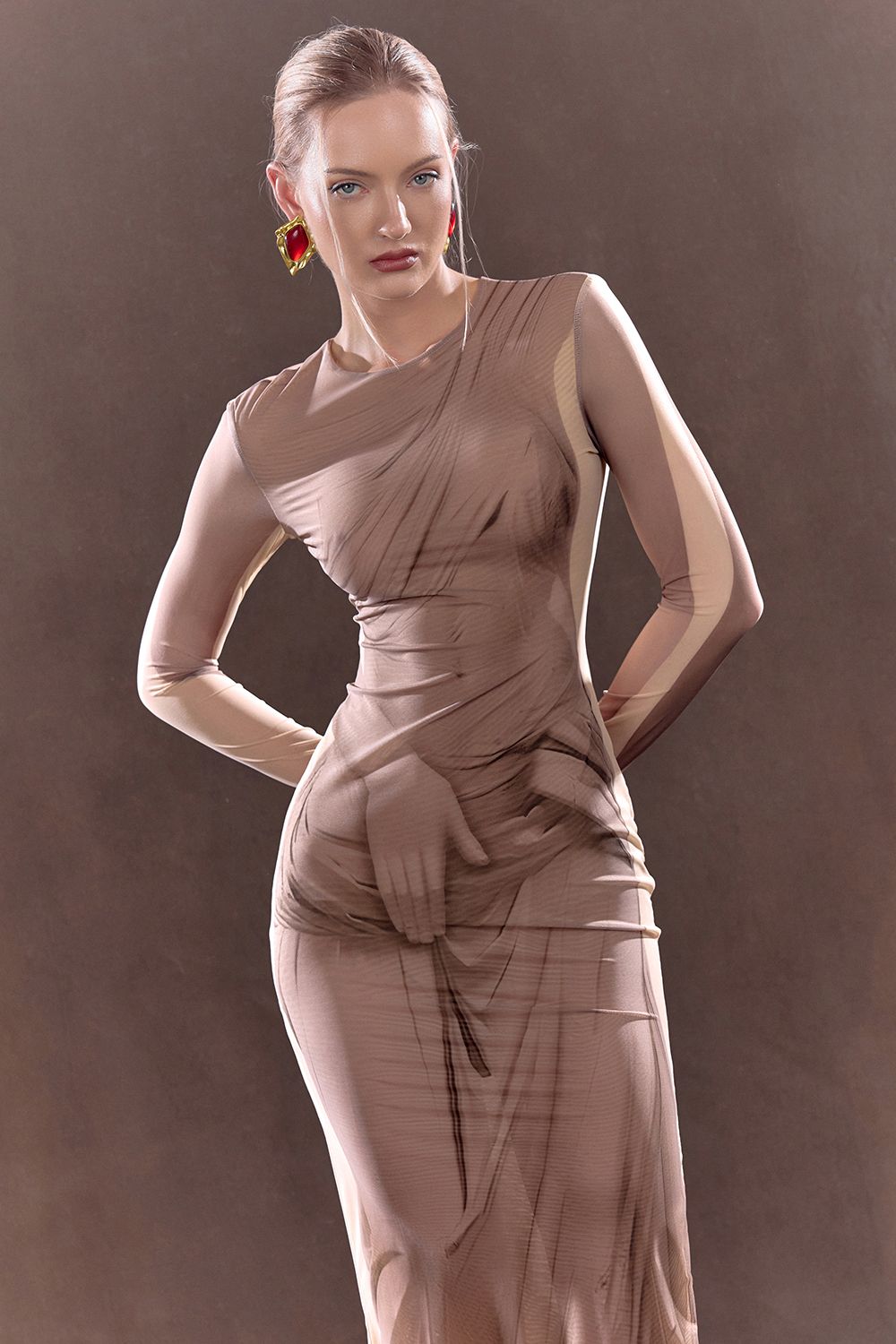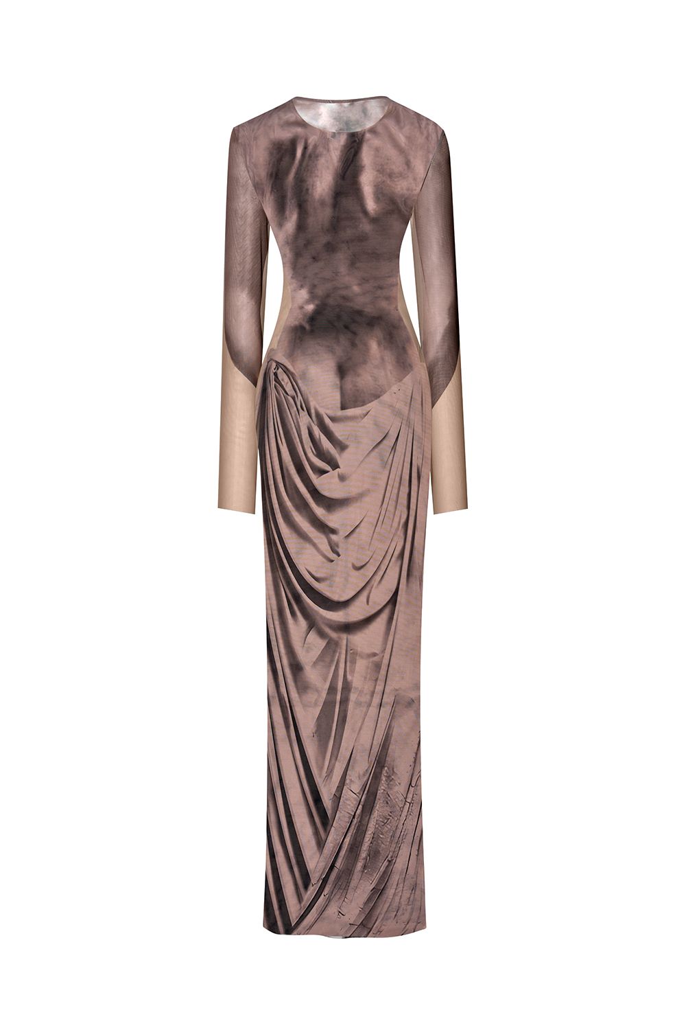 Эффектное платье, которое соединяет искусство и моду. Выполнено из тонкой ткани с эксклюзивным принтом, имитирующим драпировки и линии человеческого тела. За счёт оптического рисунка создаётся иллюзия объемных складок и мягких переходов света — платье буквально «оживает» при движении. Состав: 100% нейлон, подкладка 100% нейлон