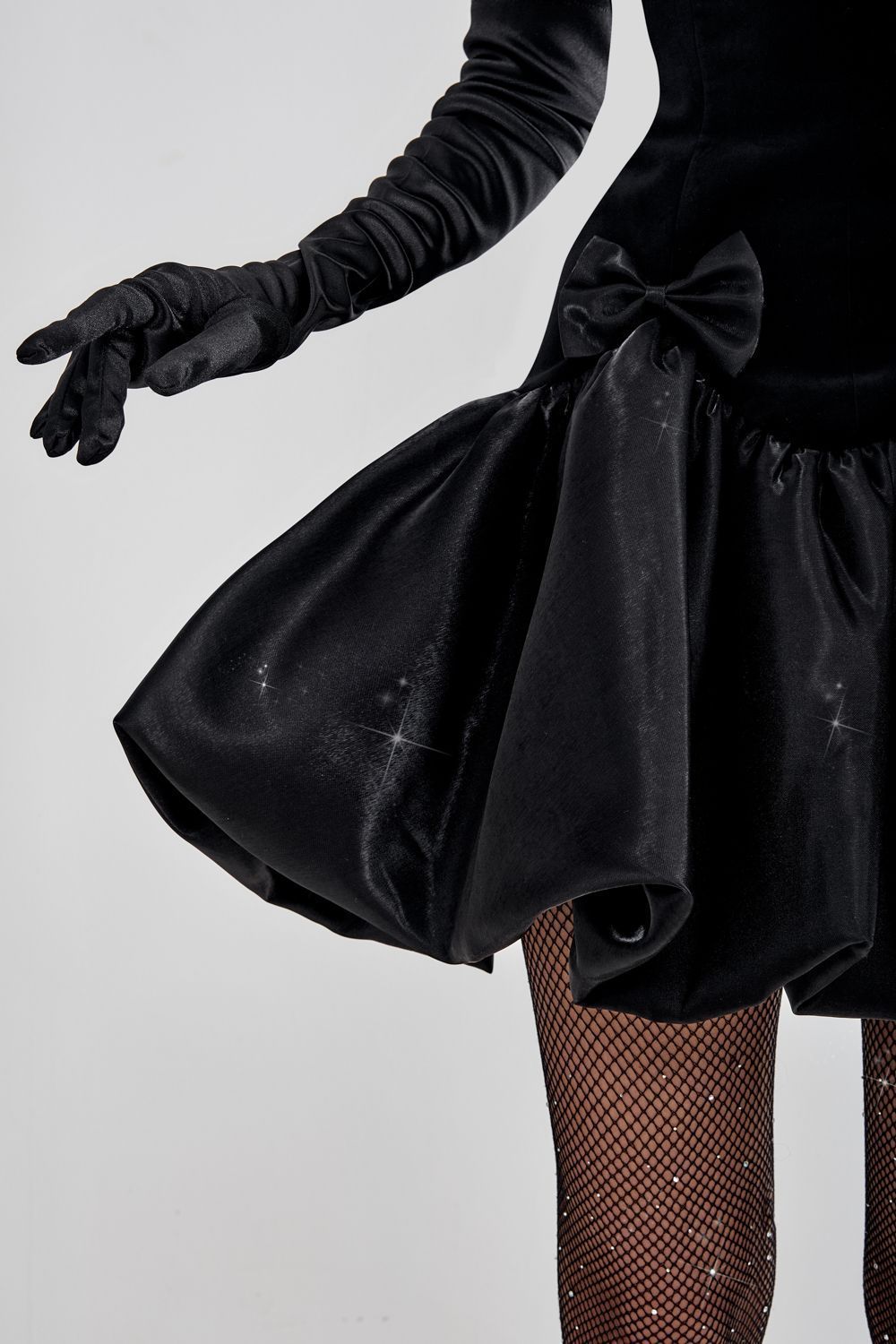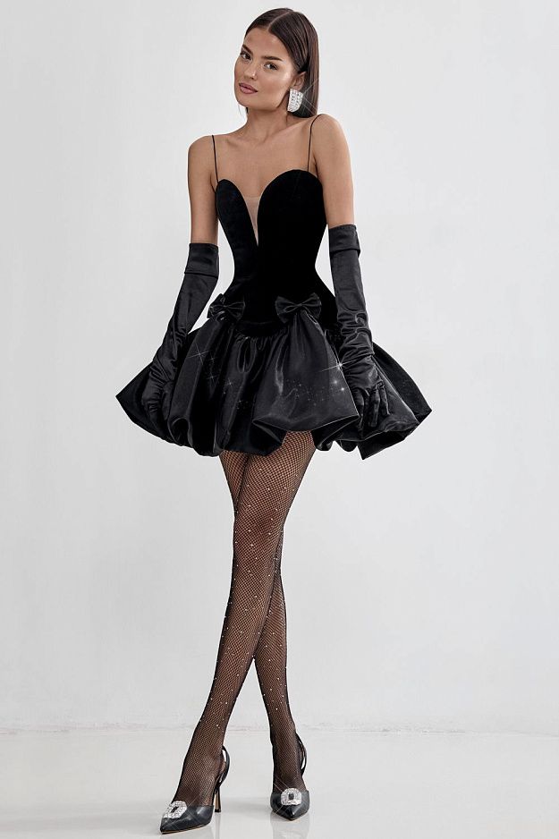 Коктейльное платье, выполненное из плотной ткани с глянцевым блеском. Верхняя часть платья имеет глубокий сердцевидный вырез на тонких бретелях, что подчеркивает зону декольте и добавляет элегантности. Юбка выполнена в формате пышного мини, с множеством сборок, создающих эффект объема и драпировки. Акцент сделан на двух декоративных бантах, расположенных на уровне талии. Состав: 100% хлопок, подкладка 95% полиэстер, 5% эластан