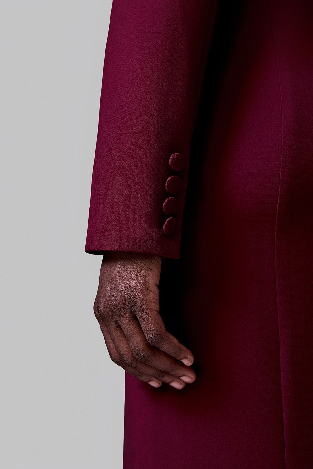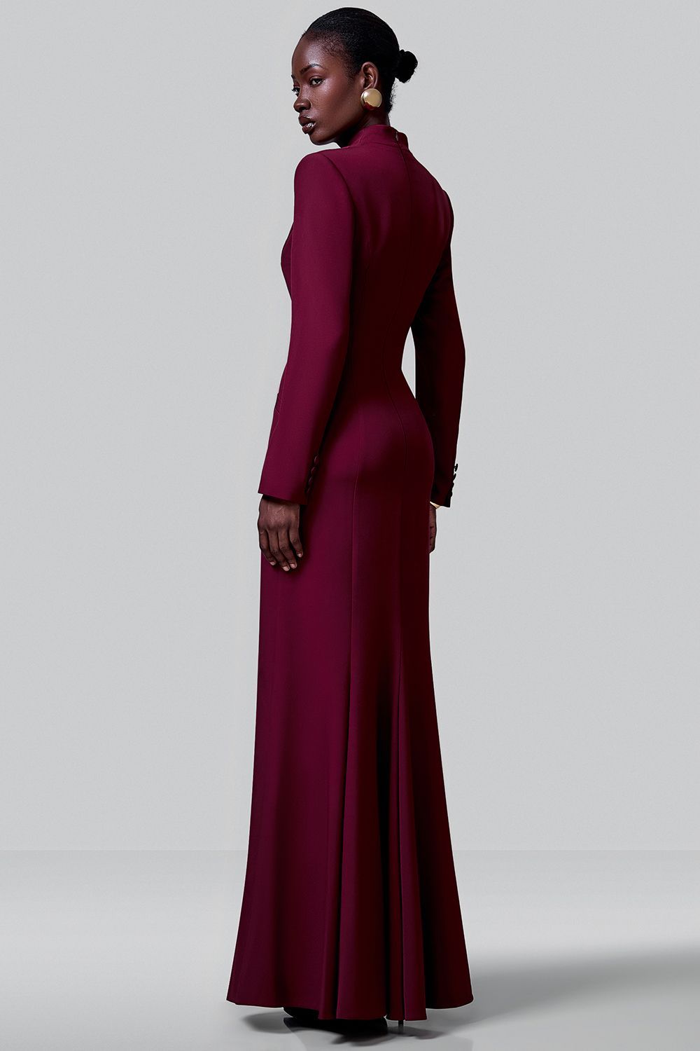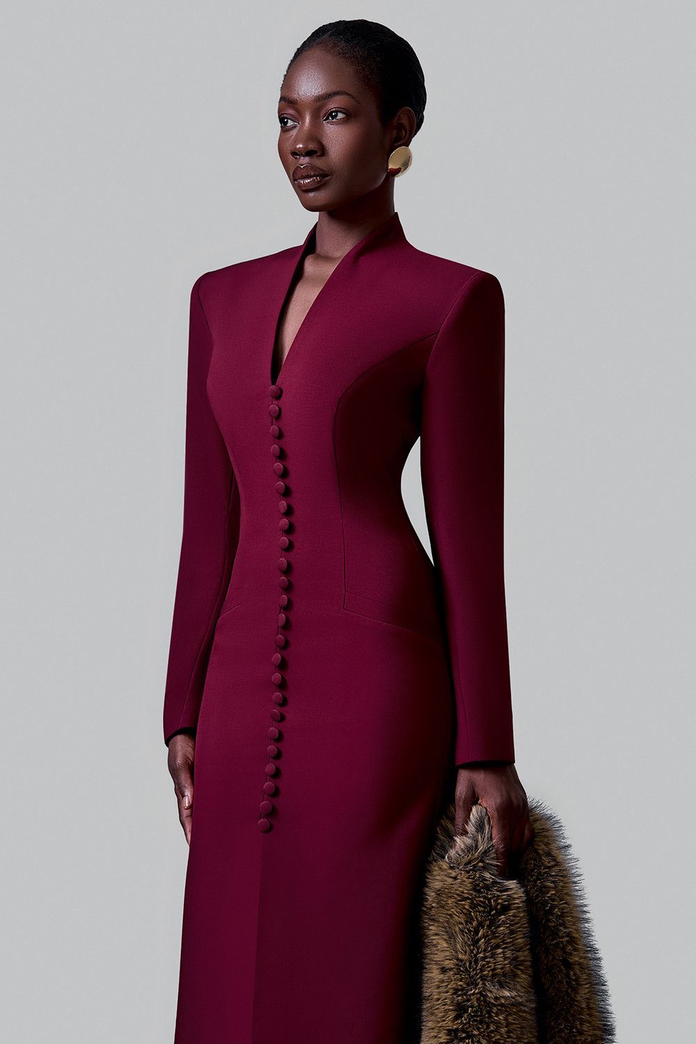 Элегантное платье длины миди. Строгий приталенный крой и вертикальный ряд обтянутых пуговиц визуально вытягивают фигуру, подчеркивая её изящество. Высокий фигурный воротник добавляет образу архитектурной чёткости, а длинные рукава усиливают эффект лаконичности. Длина платья по спинке с учетом стойки: 149 см. Состав: 97% полиэстер, 3% спандекс, подкладка 95% полиэстер, 5% эластан