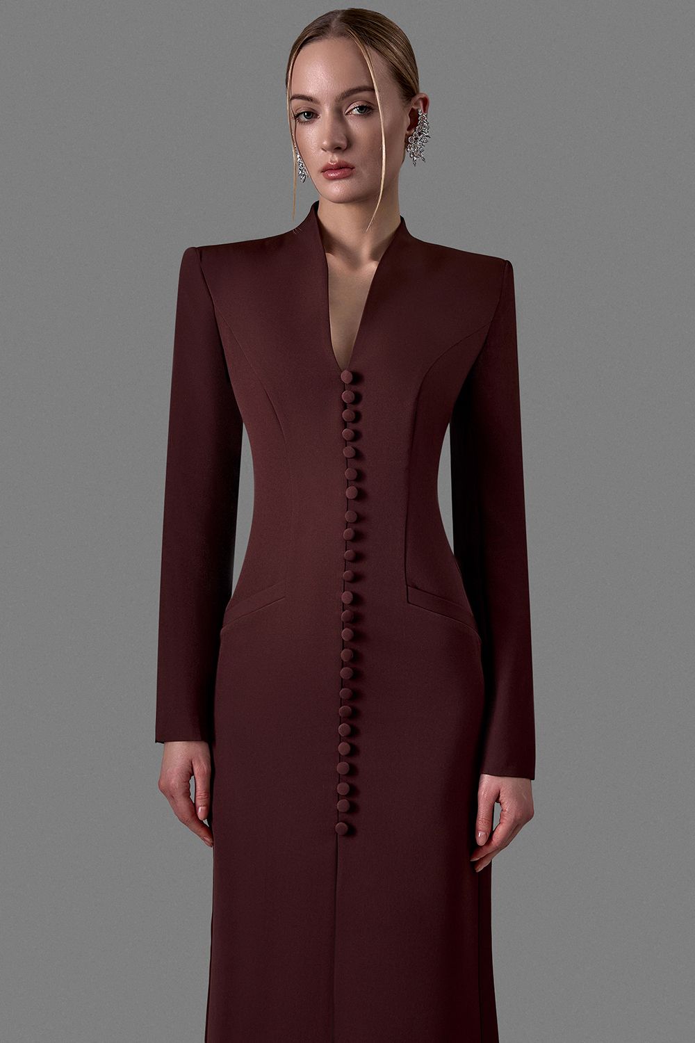 Элегантное платье длины миди. Строгий приталенный крой и вертикальный ряд обтянутых пуговиц визуально вытягивают фигуру, подчеркивая её изящество. Высокий фигурный воротник добавляет образу архитектурной чёткости, а длинные рукава усиливают эффект лаконичности. Длина платья по спинке с учетом стойки: 149 см. Состав: 97% полиэстер, 3% спандекс, подкладка 95% полиэстер, 5% эластан