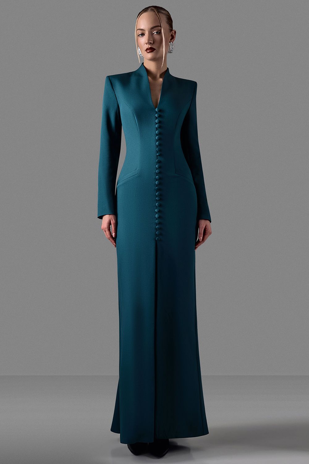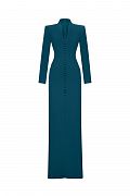 Элегантное платье длины миди. Строгий приталенный крой и вертикальный ряд обтянутых пуговиц визуально вытягивают фигуру, подчеркивая её изящество. Высокий фигурный воротник добавляет образу архитектурной чёткости, а длинные рукава усиливают эффект лаконичности. Длина платья по спинке с учетом стойки: 149 см. Состав: 97% полиэстер, 3% спандекс, подкладка 95% полиэстер, 5% эластан