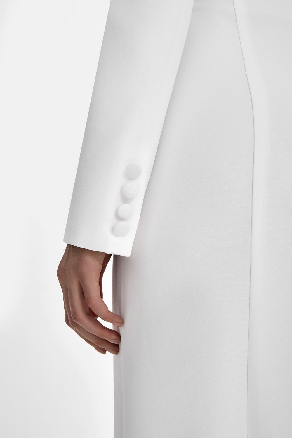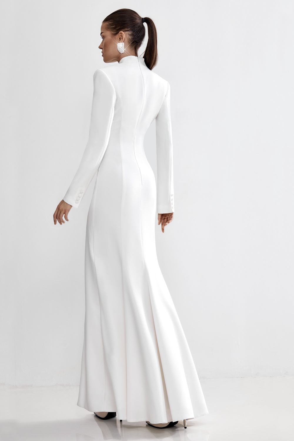 Элегантное платье длины миди. Строгий приталенный крой и вертикальный ряд обтянутых пуговиц визуально вытягивают фигуру, подчеркивая её изящество. Высокий фигурный воротник добавляет образу архитектурной чёткости, а длинные рукава усиливают эффект лаконичности. Длина платья по спинке с учетом стойки: 149 см. Состав: 71% полиэстер, 23% вискоза, 6% эластан. Подкладка: 95% полиэстер 5% эластан.