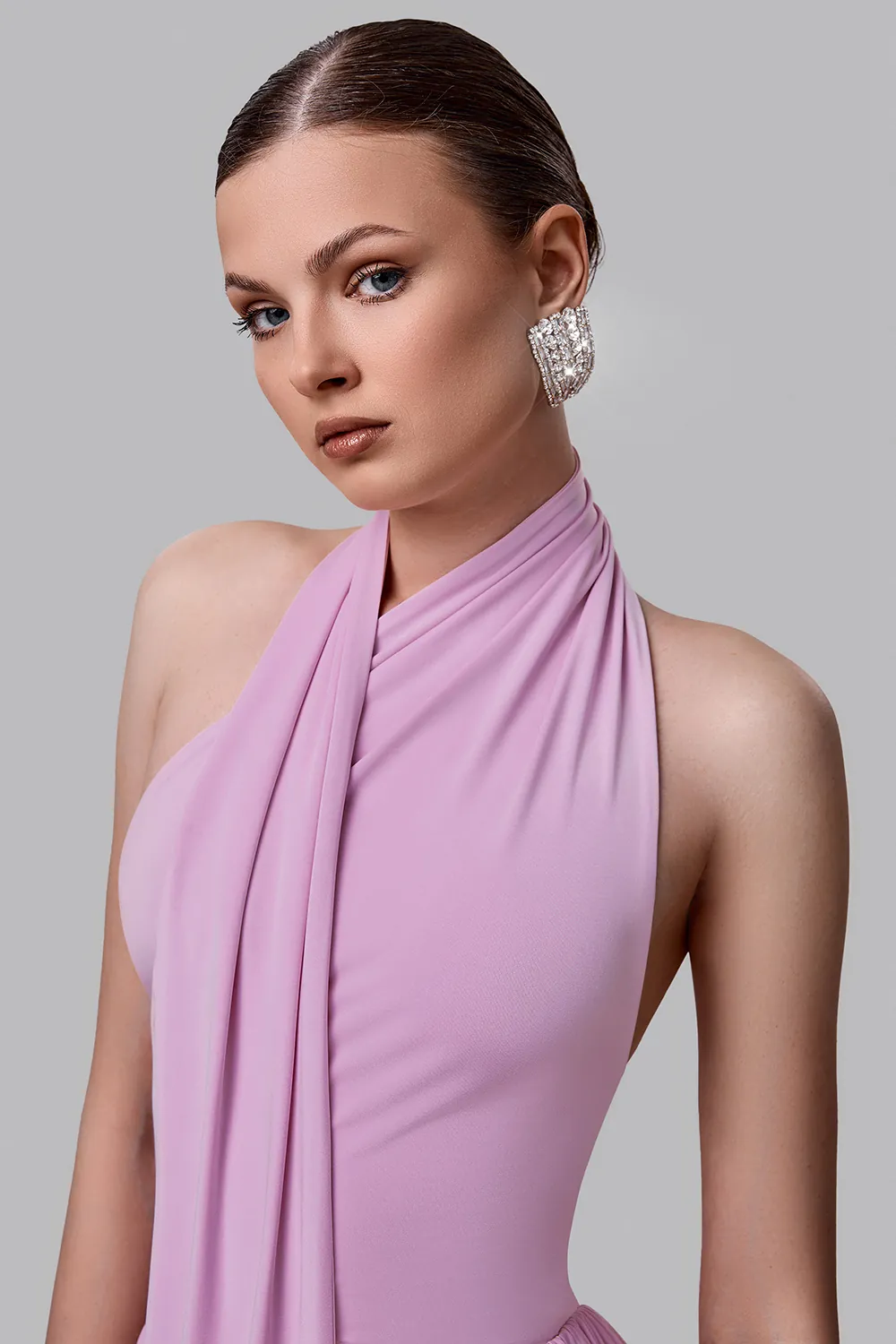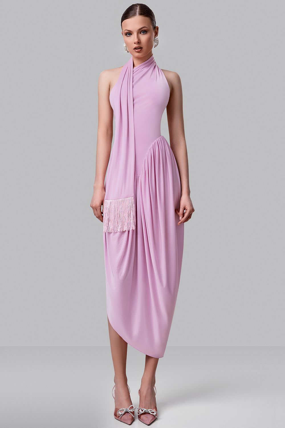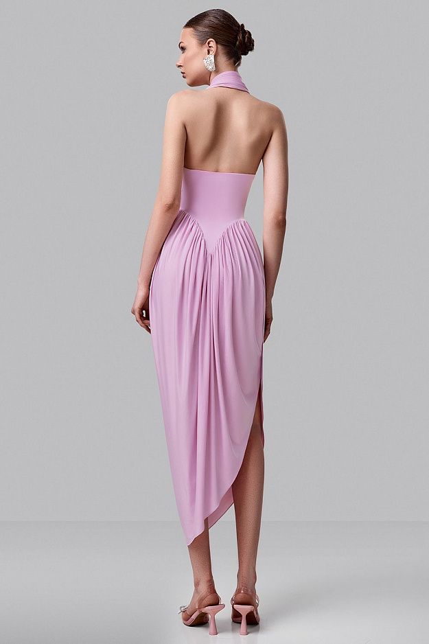 Платье с мягкой драпировкой раскрывает эстетику плавных линий и лёгкого движения. Нежный оттенок подчёркивает деликатность образа и добавляет ему утончённости. Верх с воротом-халтер красиво открывает плечи и спину, создавая чувственный силуэт. Акцент на талии и асимметричная линия низа формируют изящную геометрию фигуры. Лёгкая ткань мягко струится при движении, делая образ живым и выразительным. Состав: 100% Полиэстер