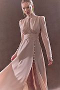 Стильное платье миди с длинными рукавами и изысканным кроем. Модель подчеркивает фигуру благодаря драпировке в области талии и мягким складкам на груди. Высокий разрез с декоративной застежкой на пуговицы добавляет женственности и смелости образу. Подходит для торжественных мероприятий, вечеринок и особых случаев. Состав: 100% полиэстер, подкладка 97% полиэстер, 3% эластан