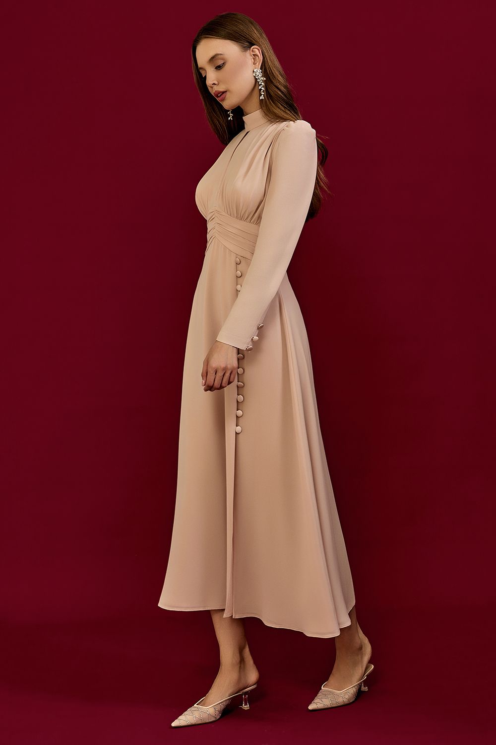 Стильное платье миди с длинными рукавами и изысканным кроем. Модель подчеркивает фигуру благодаря драпировке в области талии и мягким складкам на груди. Высокий разрез с декоративной застежкой на пуговицы добавляет женственности и смелости образу. Подходит для торжественных мероприятий, вечеринок и особых случаев. Состав: 100% полиэстер, подкладка 97% полиэстер, 3% эластан