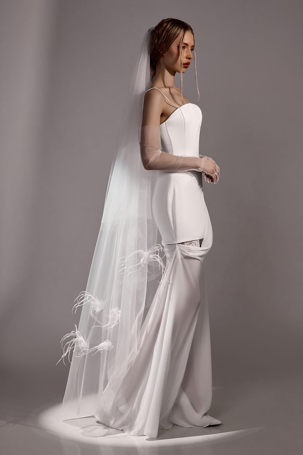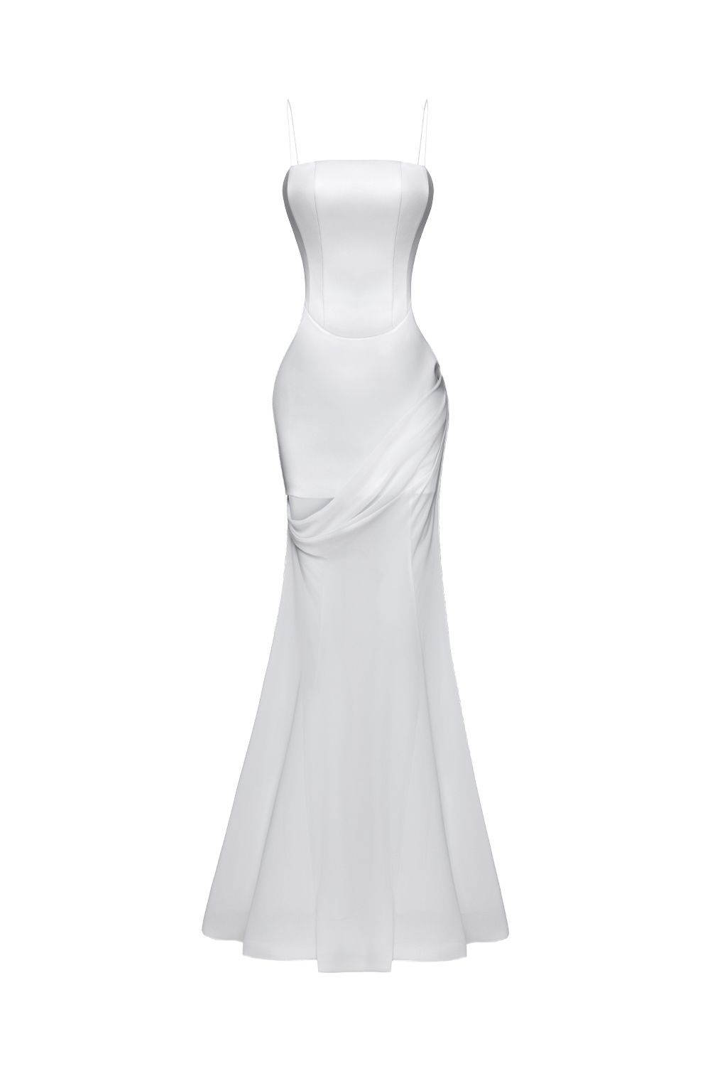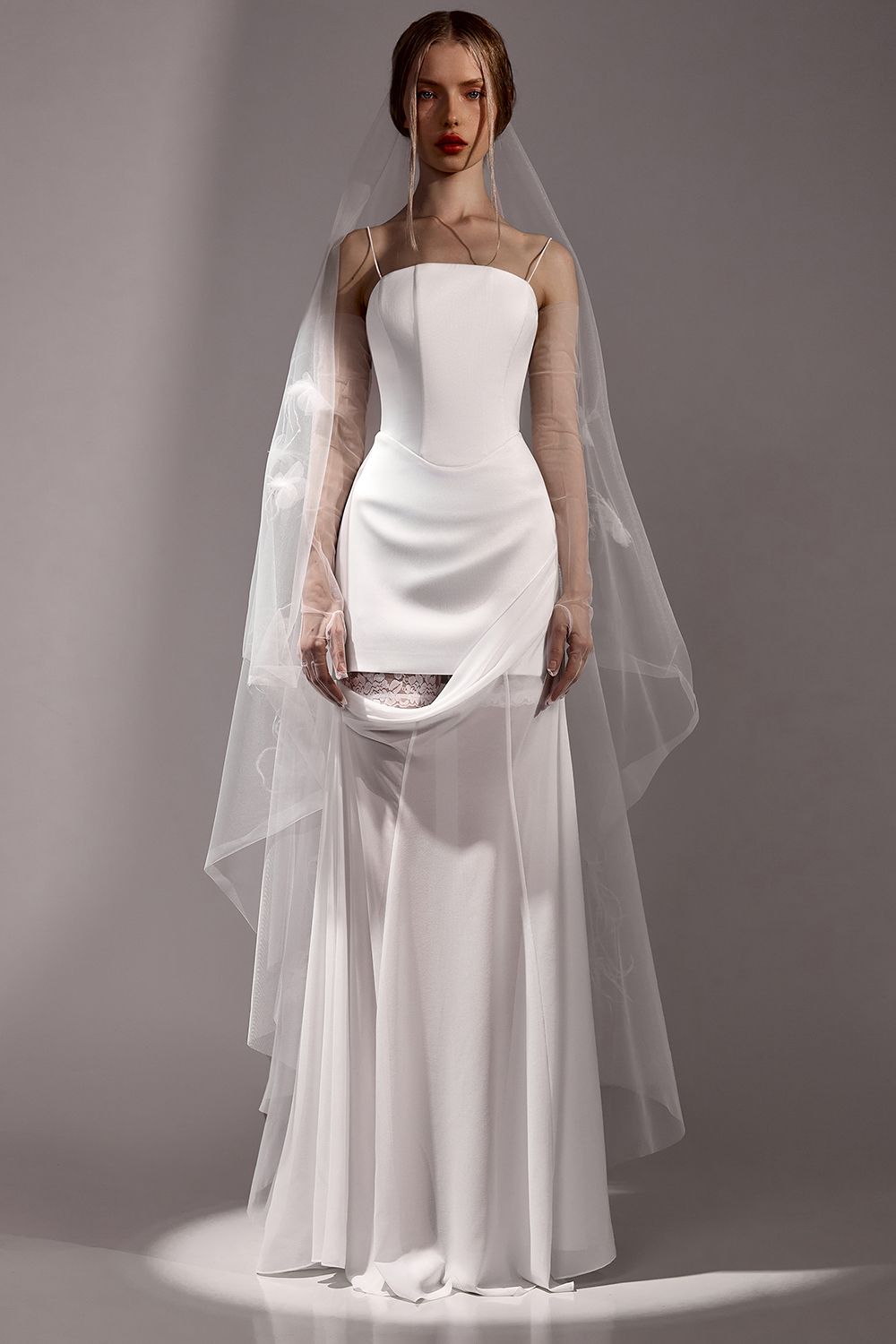Элегантное платье макси с корсетным лифом, подчёркивающее фигуру и создающее утончённый, вытянутый силуэт. Лаконичный верх на тонких бретелях акцентирует линию плеч и декольте, придавая образу лёгкость и хрупкость. Мягкая драпировка по линии талии плавно переходит в струящуюся юбку, создавая эффект движения и визуальную лёгкость. Пластичная ткань красиво ложится по фигуре, подчеркивая женственные линии. Особенность модели — съёмная нижняя юбка, которая позволяет трансформировать образ: от более закрытого и торжественного до лёгкого и чувственного. Идеальное решение для мероприятий, где важна универсальность и возможность менять настроение образа. Платье подойдёт для вечерних выходов, свадебных образов и особых случаев, сочетая в себе нежность, функциональность и современную элегантность. Состав: Верх: 63% полиэстер,37% вискоза; низ:100% полиэстер; подкладка: 95% полиэстер, 5% эластан