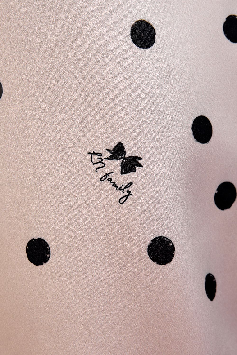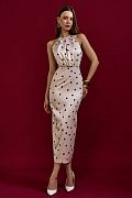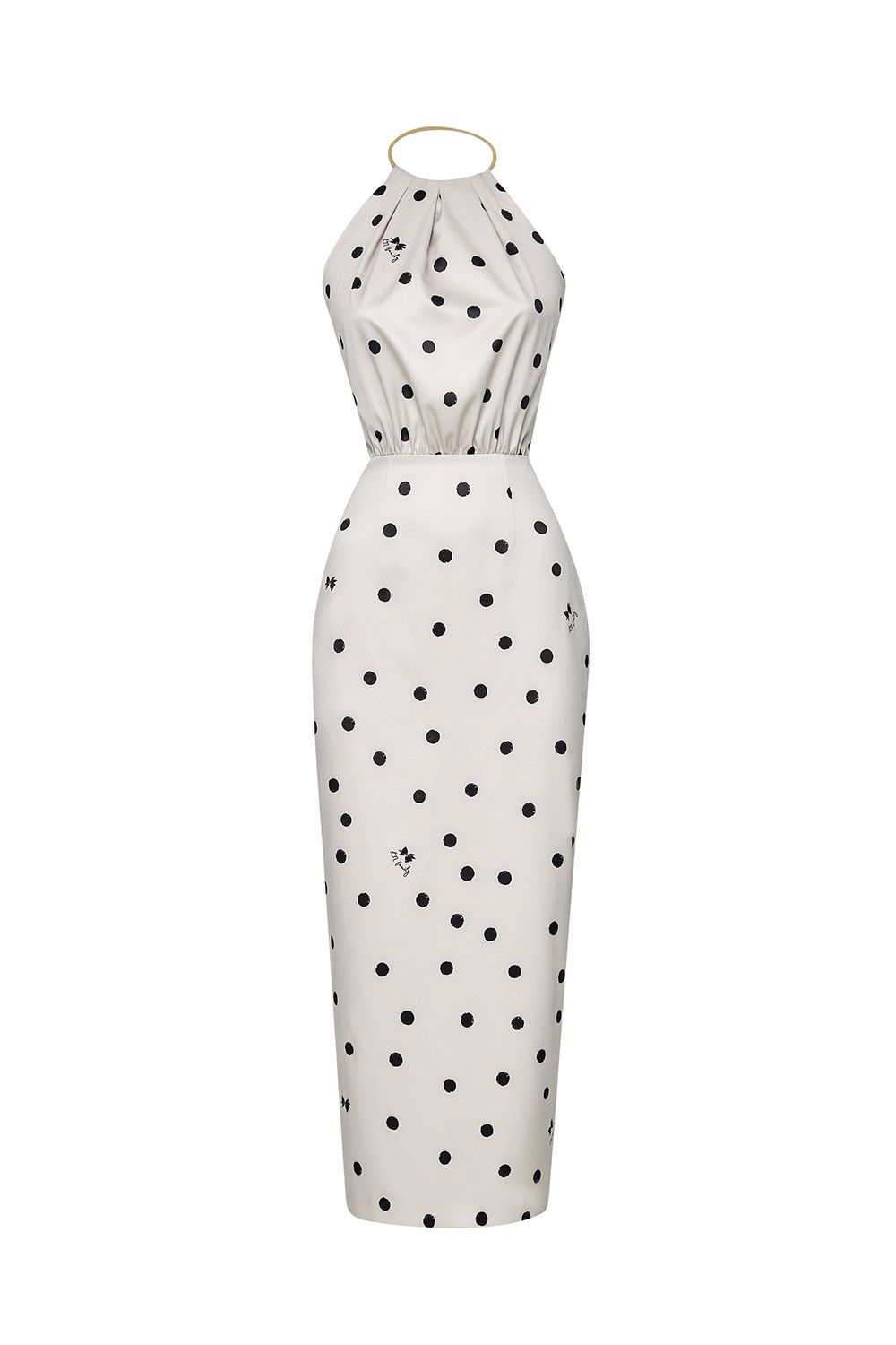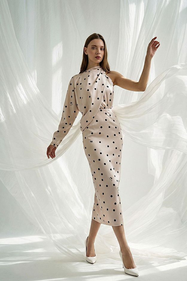 Элегантное платье из атласной ткани с благородным блеском и контрастным гороховым принтом. Модель состоит из двух деталей: основы с открытым верхом на кольце-халтере и съёмной накидки с длинным рукавом. Деталь с рукавом легко фиксируется и снимается, позволяя менять образ — от утончённого вечернего силуэта до более сдержанного и закрытого. Состав: 100% полиэстер, подкладка 95% полиэстер, 5% эластан