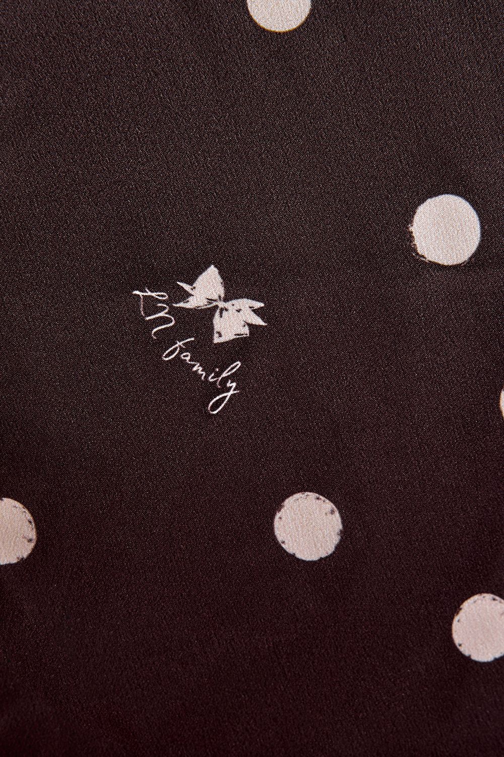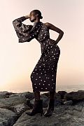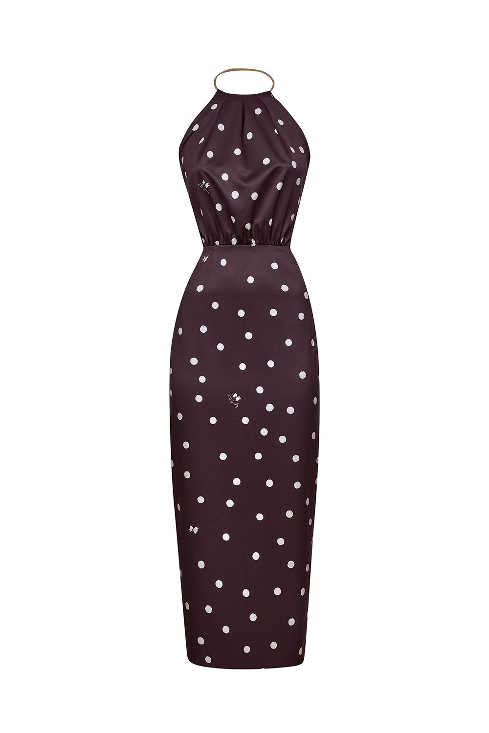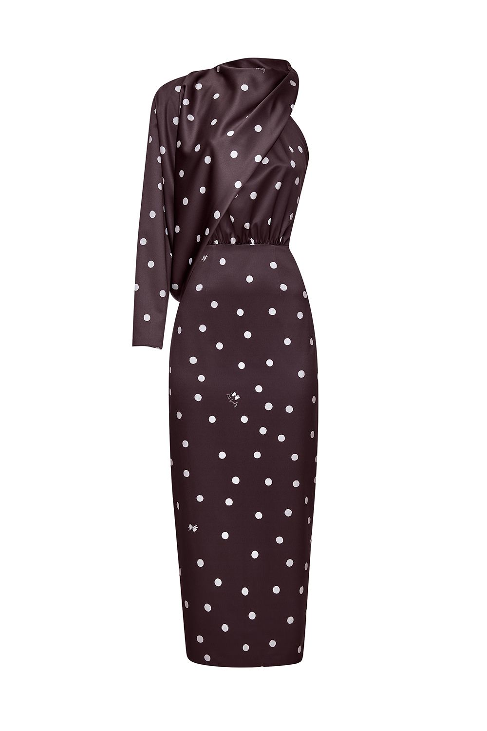 Элегантное платье из атласной ткани с благородным блеском и контрастным гороховым принтом. Модель состоит из двух деталей: основы с открытым верхом на кольце-халтере и съёмной накидки с длинным рукавом. Деталь с рукавом легко фиксируется и снимается, позволяя менять образ — от утончённого вечернего силуэта до более сдержанного и закрытого. Состав: 100% полиэстер, подкладка 95% полиэстер, 5% эластан