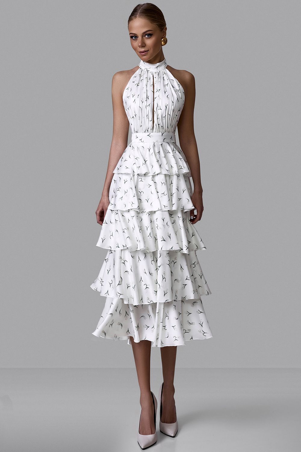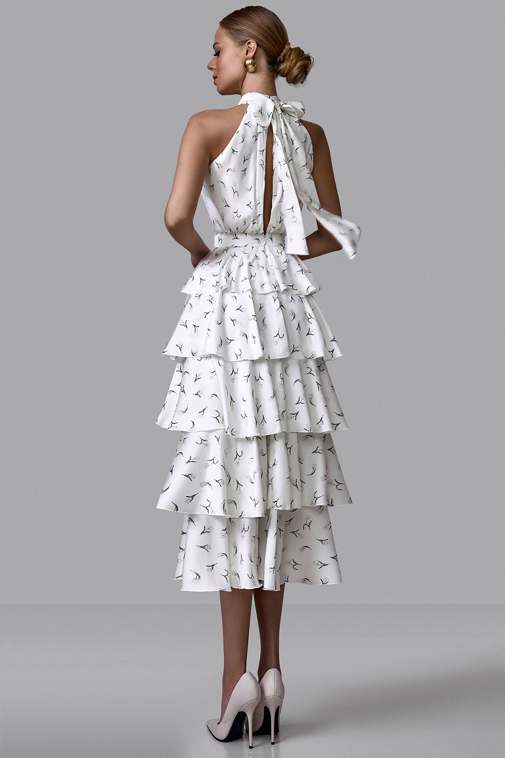 Платье миди с ярусной юбкой и эксклюзивным принтом