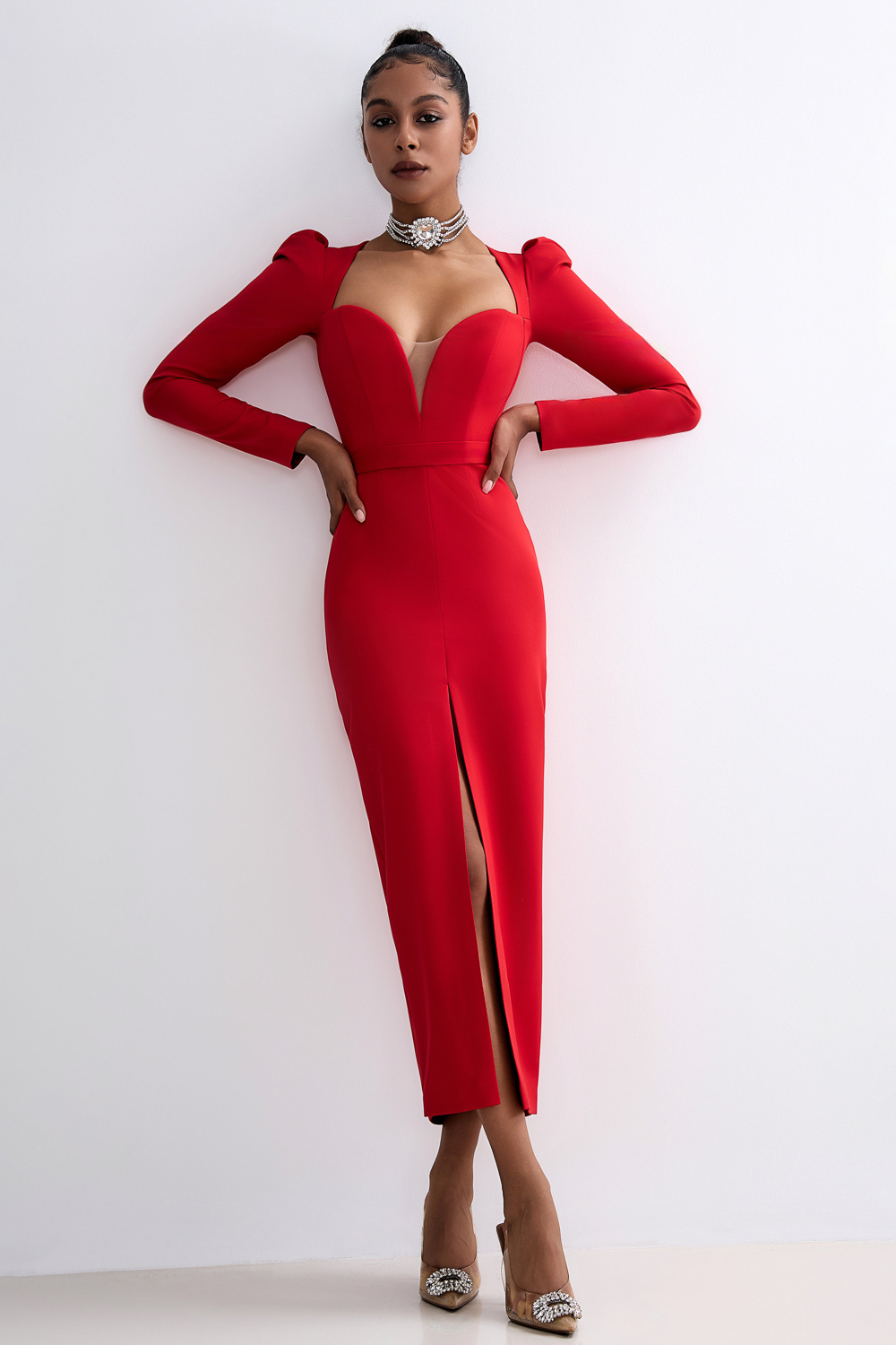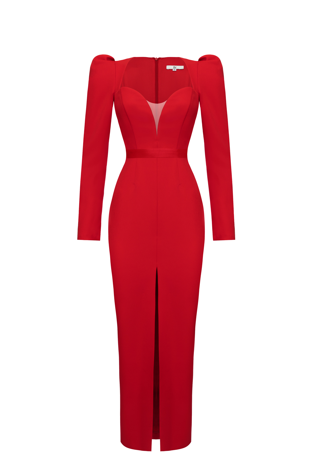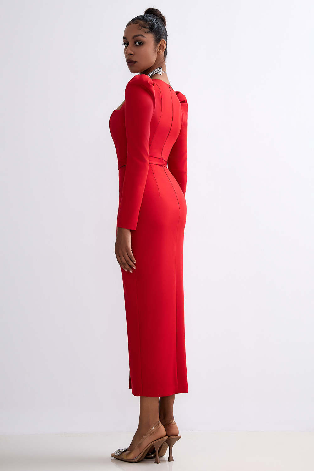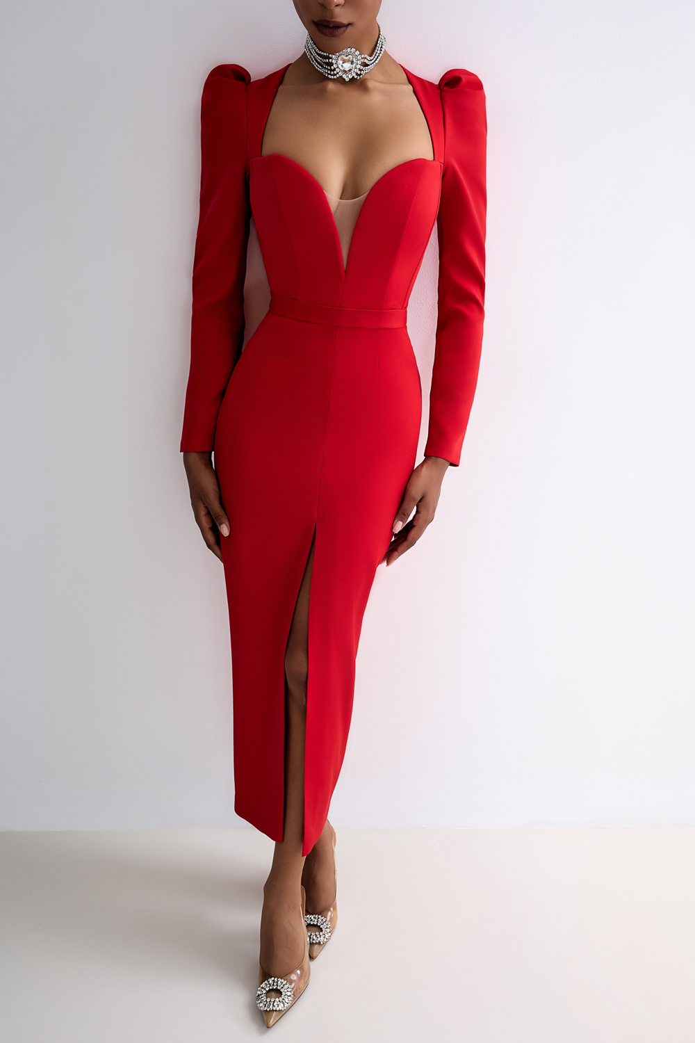 Платье миди из плотной костюмной ткани с эффектом лёгкой коррекции фигуры. Глубокий фигурный вырез и длинные рукава создают гармоничный баланс откровенности и элегантности. Вертикальный разрез спереди обеспечивает свободу движений и визуально удлиняет силуэт. Состав: 71% полиэстер, 23% вискоза, 6% эластан, Подклад 95% полиэстер 5% эластан
