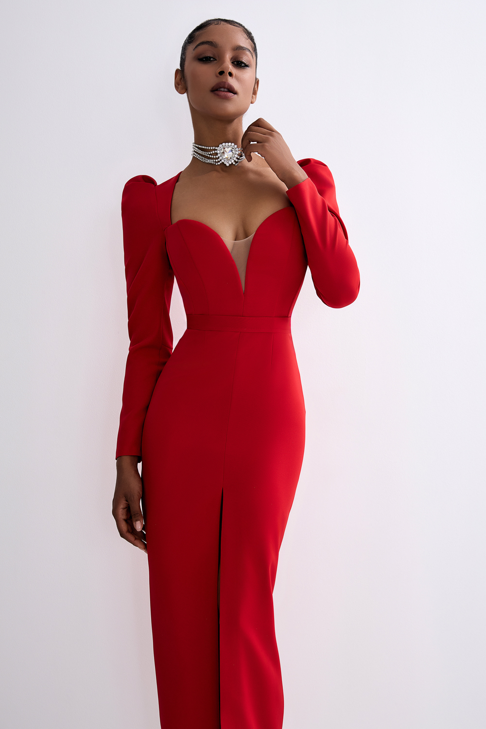 Платье с разрезом и акцентной линией груди