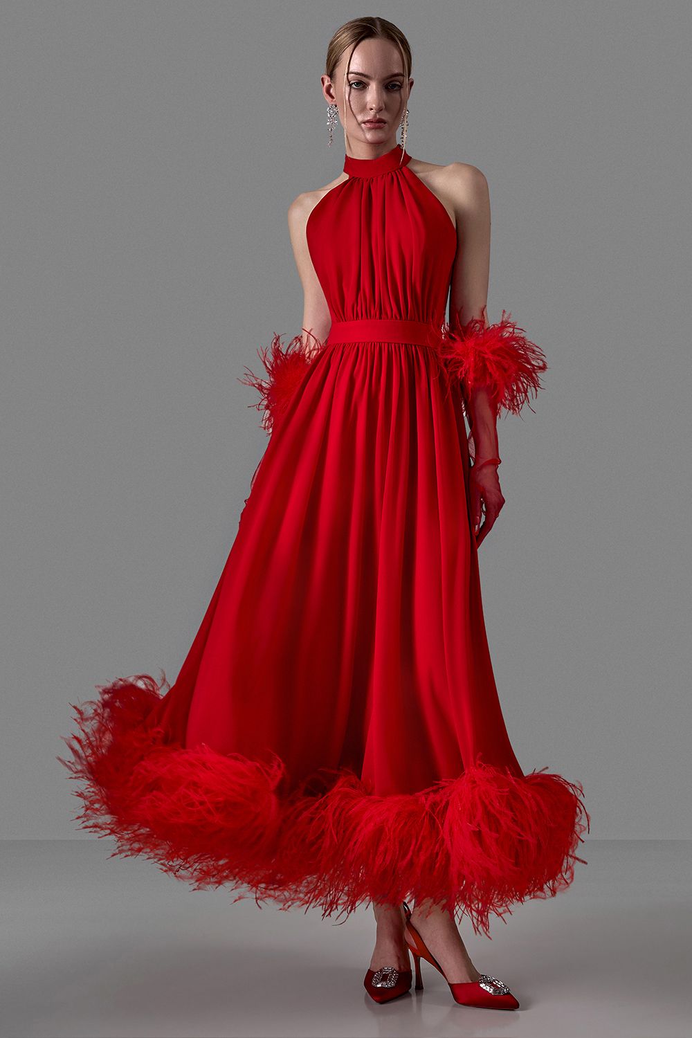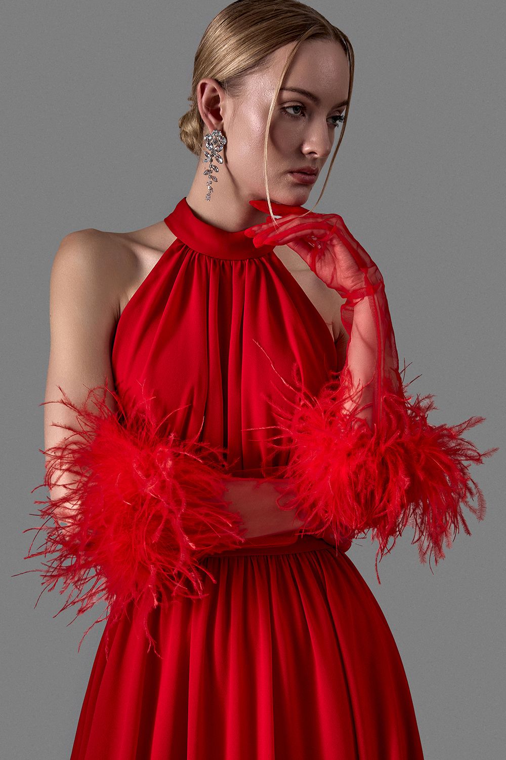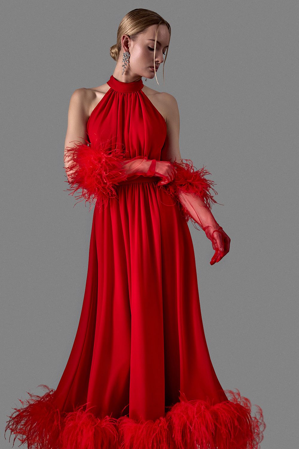 Эффектное платье-халтер с летящим силуэтом и роскошной перьевой отделкой по подолу и манжетам. Модель подчёркивает талию, мягко струится при движении и создаёт яркий, запоминающийся вечерний образ. Идеально для торжеств, съёмок и выходов, где хочется максимального вау-эффекта. Состав: 100% полиэстер, подкладка 97% полиэстер, 3% эластан