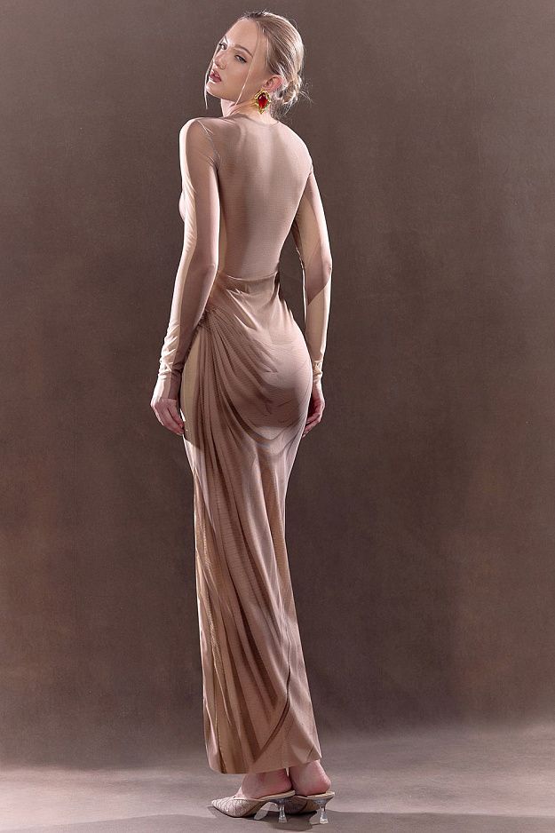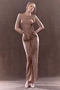 Эффектное платье, которое соединяет искусство и моду. Выполнено из тонкой ткани с эксклюзивным принтом, имитирующим драпировки и линии человеческого тела. За счёт оптического рисунка создаётся иллюзия объемных складок и мягких переходов света — платье буквально «оживает» при движении. Состав: 100% нейлон, подкладка 100% нейлон