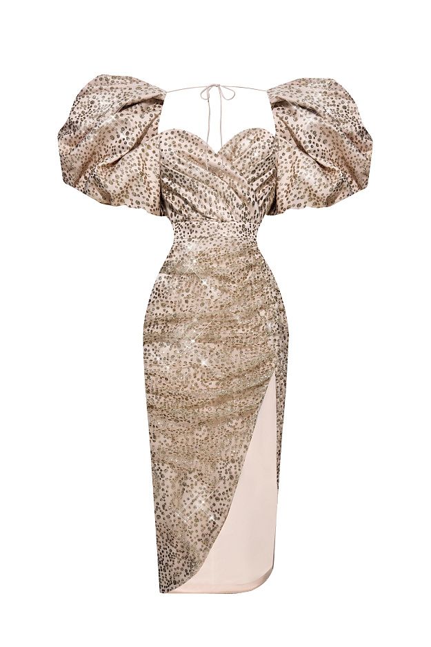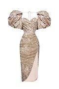 Платье длины миди с корсетным лифом и ненавязчивой драпировкой. Объемные рукава. Застежка-молния сзади. На модели размер S. Ткань с нанесением глиттера. Незначительное осыпание в процессе эксплуатации (особенно в первые несколько использований или при интенсивном трении/контакте) является неизбежной особенностью данного вида декора. Длина от талии 85 см. Состав: верх 100% полиэстер, низ 63% полиэстер, 37% вискоза. Подклад: 95% полиэстер, 5% эластан.