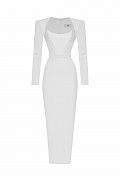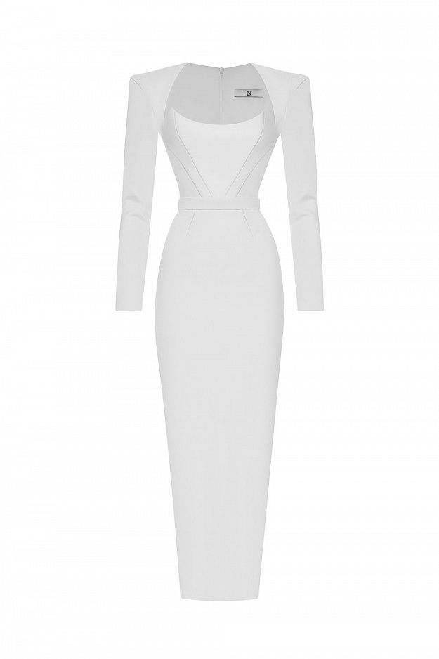 Платье длины миди. Футлярный крой подчёркивает фигуру, а продуманные конструктивные элементы создают эффект скульптурности. Длинные рукава и четко очерченные плечи придают образу силу и элегантность, в то время как мягкая линия выреза вносит нотку утончённой чувственности. Минималистичный дизайн позволяет платью быть универсальной основой как для вечернего выхода, так и для статусного дневного мероприятия. Состав:68% вискоза, 27% нейлон, 5% эластан; подкладка: 95% полиэстер, 5% эластан