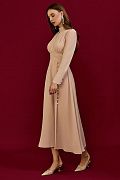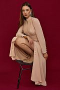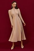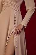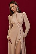 Стильное платье миди с длинными рукавами и изысканным кроем. Модель подчеркивает фигуру благодаря драпировке в области талии и мягким складкам на груди. Высокий разрез с декоративной застежкой на пуговицы добавляет женственности и смелости образу. Подходит для торжественных мероприятий, вечеринок и особых случаев. Состав: 100% полиэстер, подкладка 97% полиэстер, 3% эластан