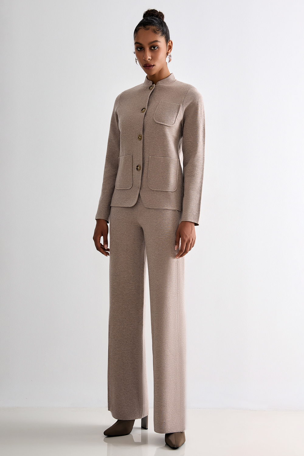 Трикотажный костюм. Длина брючины по внутреннему шву 79 см. Состав: 39% полиэстер,35% акрил,20% полиамид, 6% шерсть