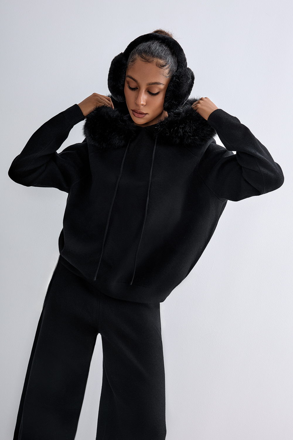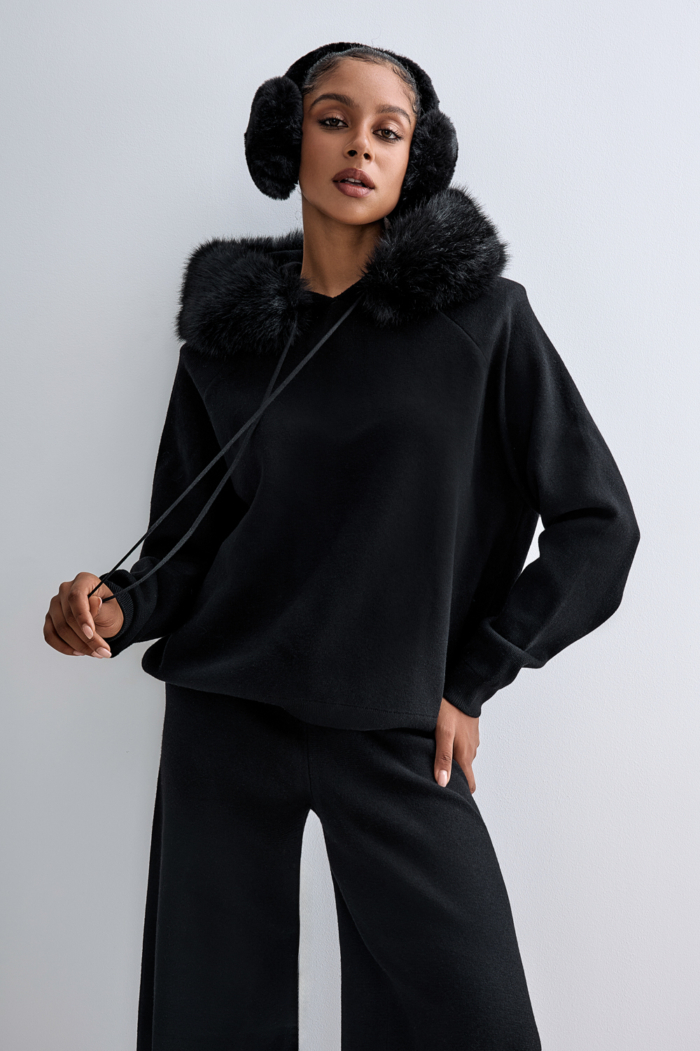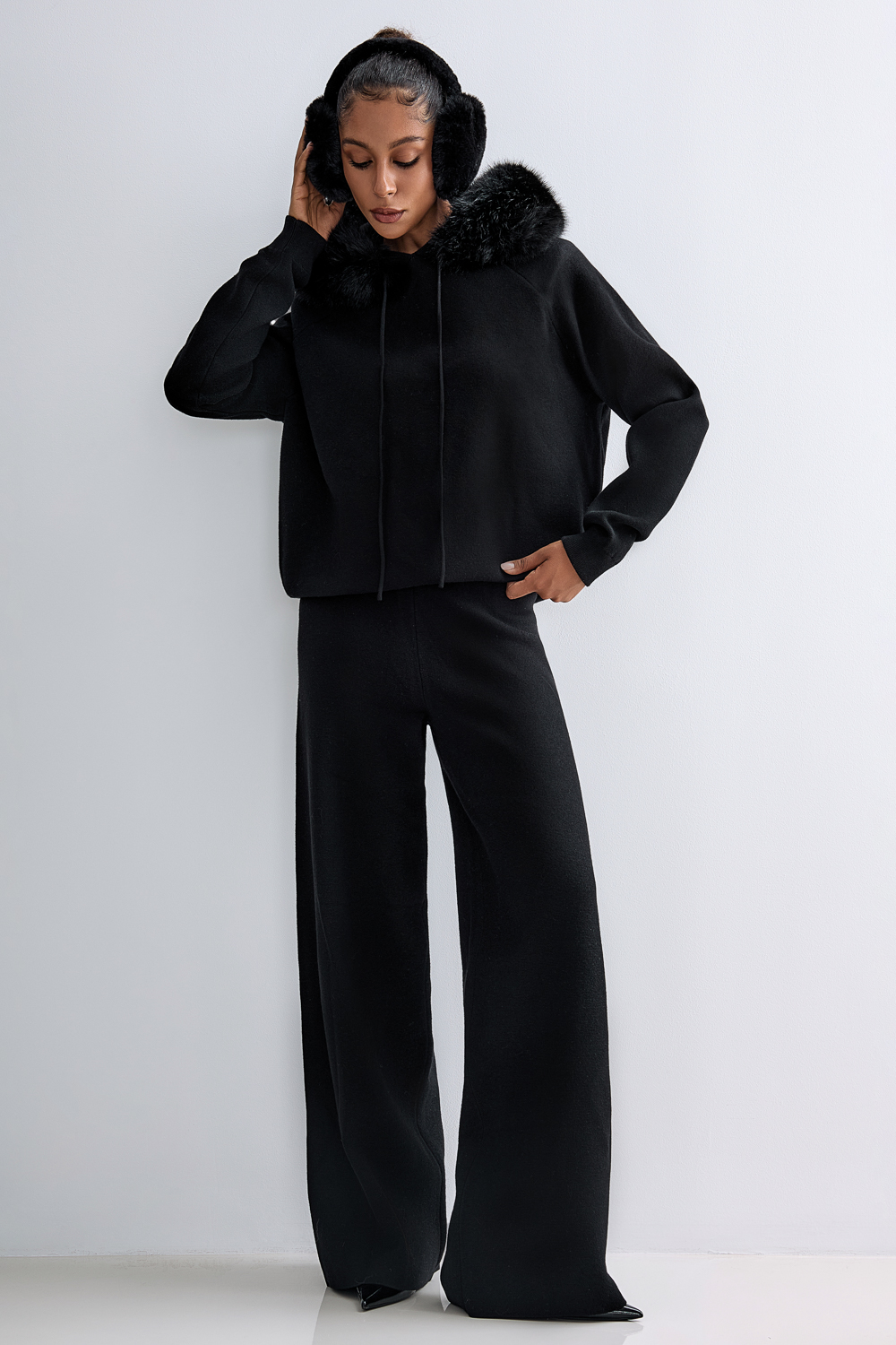 Элегантный трикотажный костюм из мягкого, тактильно приятного полотна. Свитшот свободного кроя с капюшоном, украшенным съёмной отделкой из эко-меха, создаёт ощущение уюта и комфорта. Брюки с высокой посадкой и широким прямым силуэтом визуально удлиняют ноги и формируют лаконичный образ. Состав: 39% полиэстер,35% акрил,20% полиамид, 6% шерсть