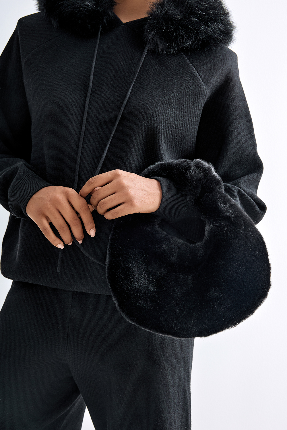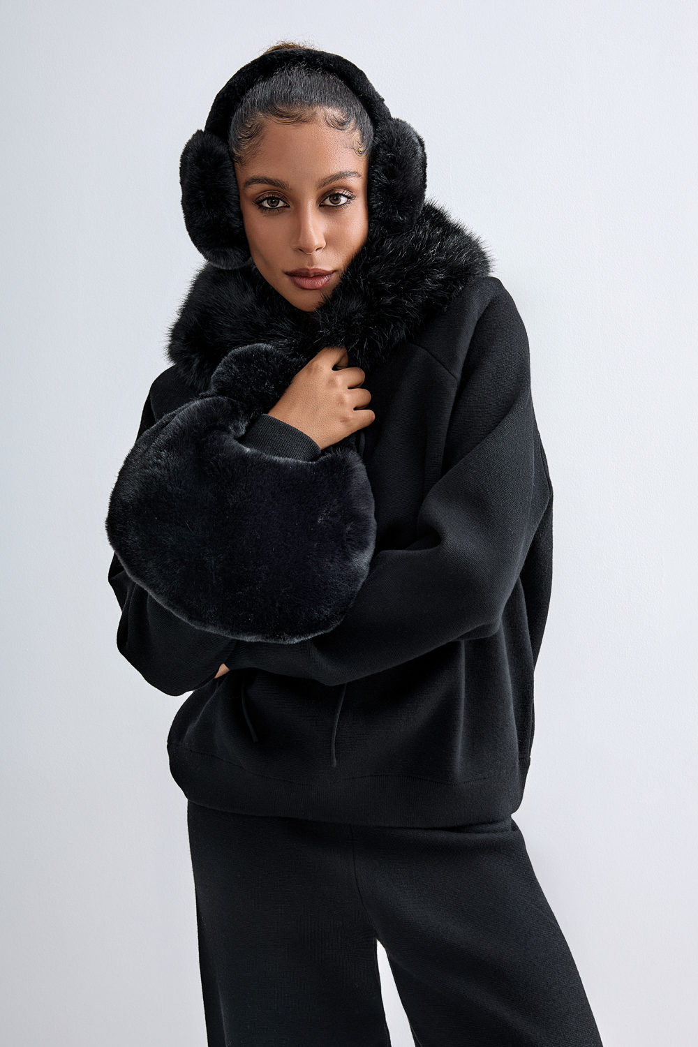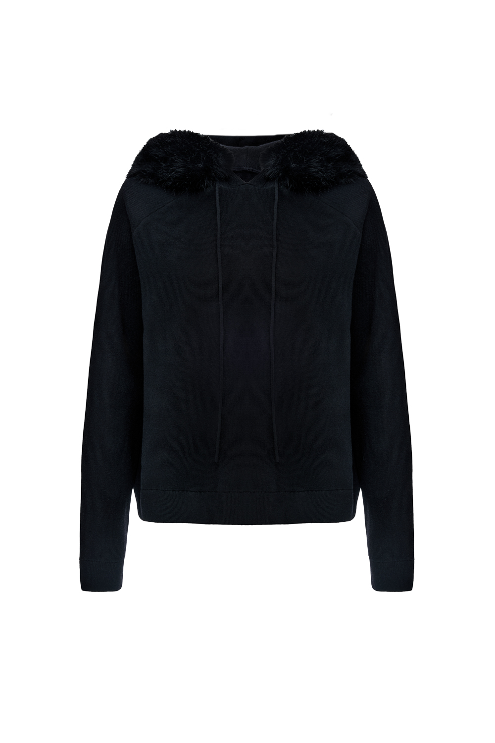 Элегантный трикотажный костюм из мягкого, тактильно приятного полотна. Свитшот свободного кроя с капюшоном, украшенным съёмной отделкой из эко-меха, создаёт ощущение уюта и комфорта. Брюки с высокой посадкой и широким прямым силуэтом визуально удлиняют ноги и формируют лаконичный образ. Состав: 39% полиэстер,35% акрил,20% полиамид, 6% шерсть