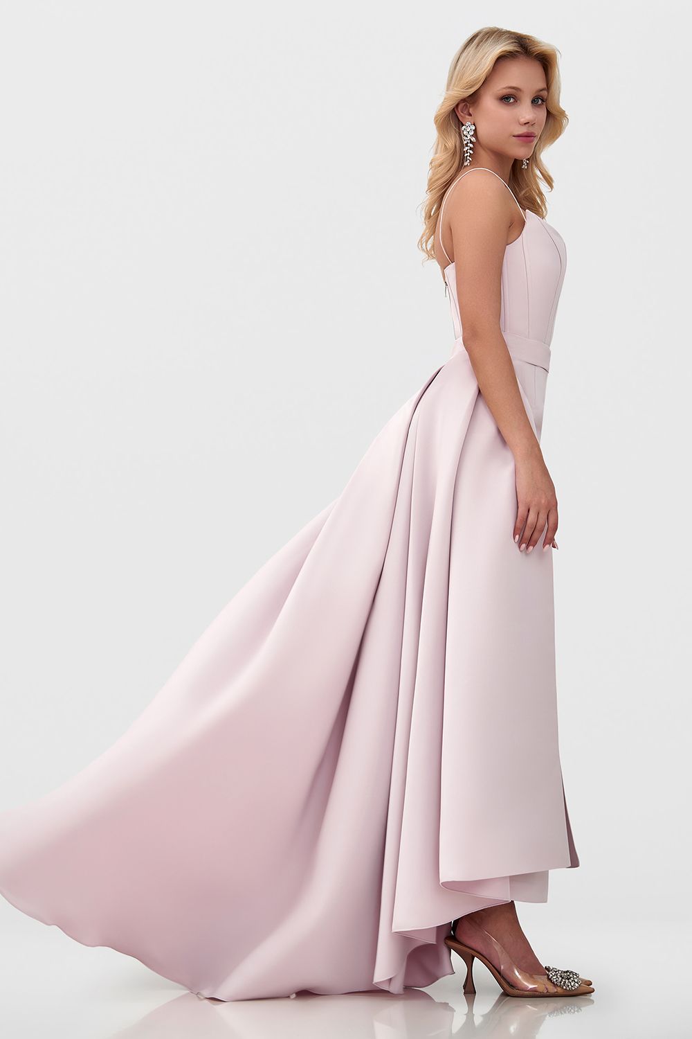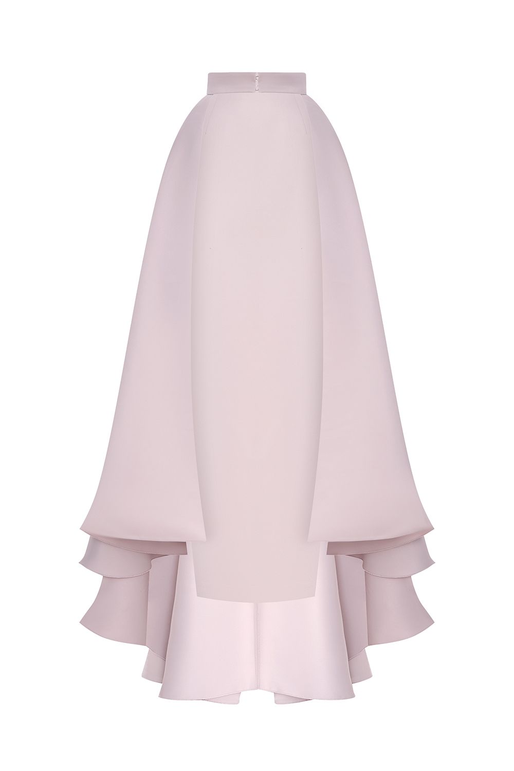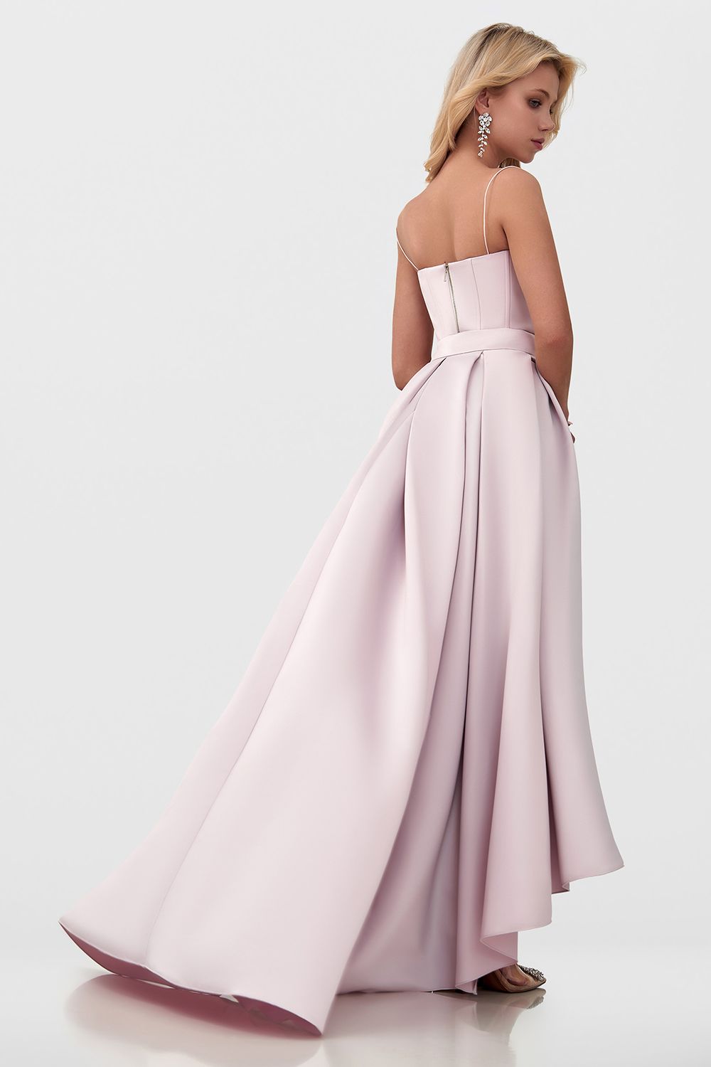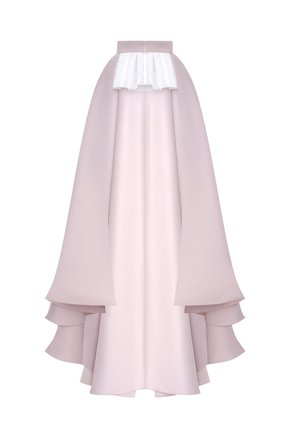 Шлейф выполнен из плотной ткани и гармонично продолжает силуэт. Он начинается от линии талии, плавно ниспадает крупными мягкими складками и раскрывается при движении, создавая эффект объёма и лёгкости. Длина шлейфа делает образ более торжественным и зрелищным, а асимметричный крой добавляет современную изюминку. Состав: 100% Полиэстер