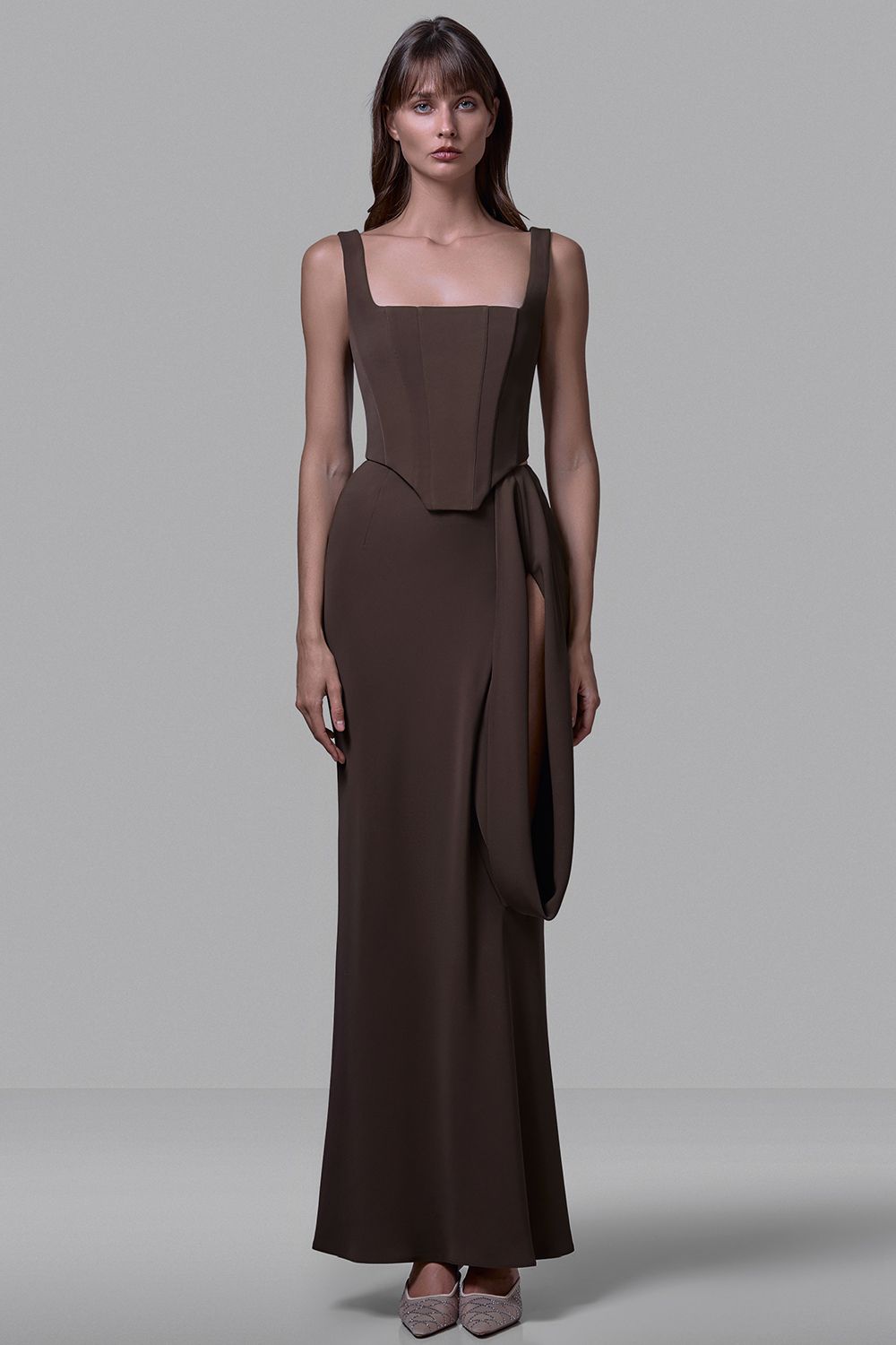 Юбка выполнена в длине макси и имеет изысканный минималистичный крой.Особый акцент сделан на высоком разрезе сбоку, дополненном мягкой драпировкой, которая образует элегантную складку и добавляет объема. Посадка высокая, что визуально вытягивает силуэт и гармонично сочетается с корсетным верхом. Состав: 72% полиэстер, 15% нейлон, 10% вискоза, 3% эластан;подкладка:95% полиэстер,5% эластан