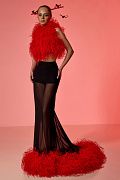 Эффектная юбка макси, созданная для акцентных вечерних и сценических образов. Модель выполнена из полупрозрачной струящейся ткани, подчёркивающей силуэт, с высокой посадкой и мягким расклёшением к низу. Главный акцент - роскошная отделка из натуральных перьев страуса по нижнему краю. Состав: 100% Полиэстер; Подкладка 100% Полиэстер