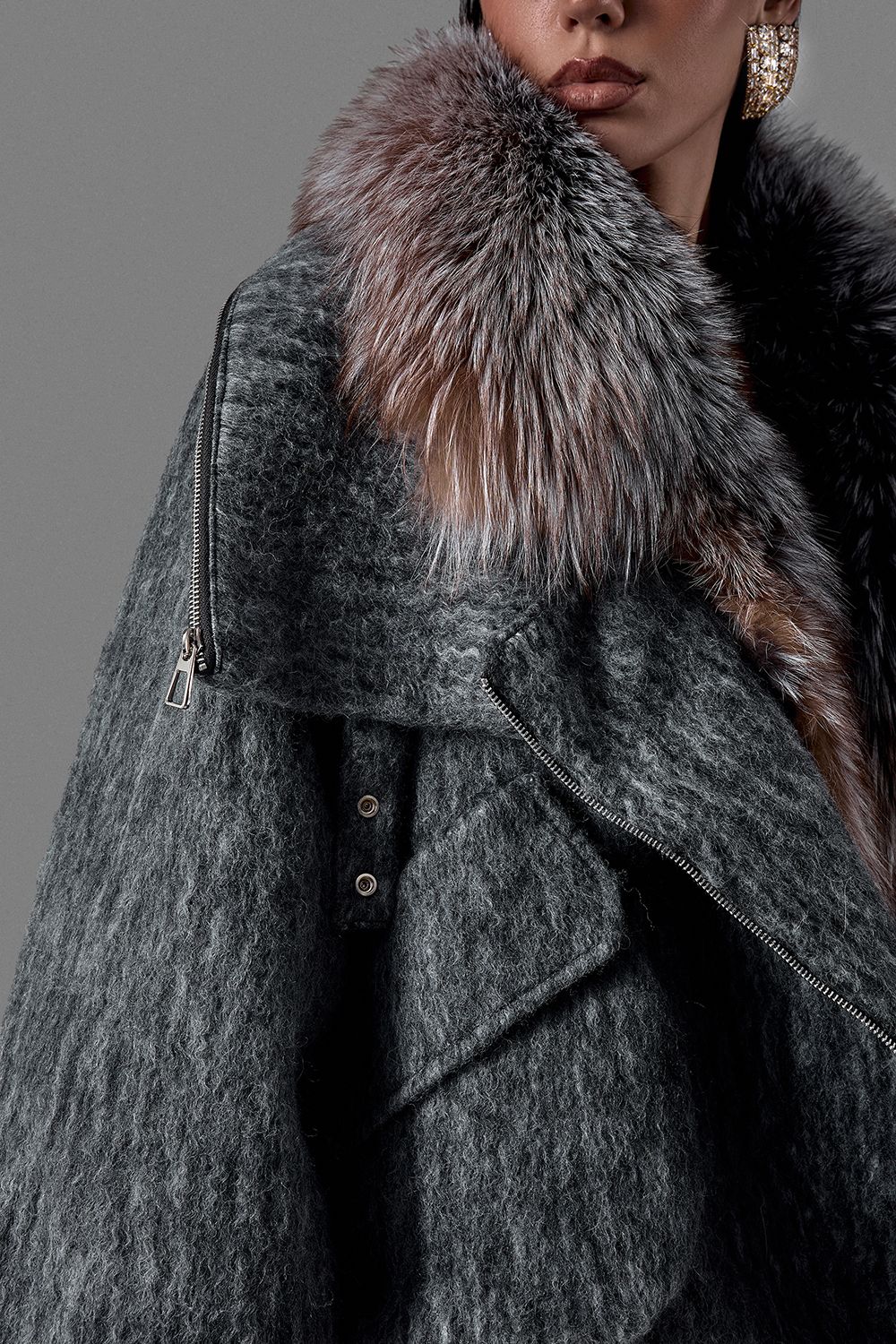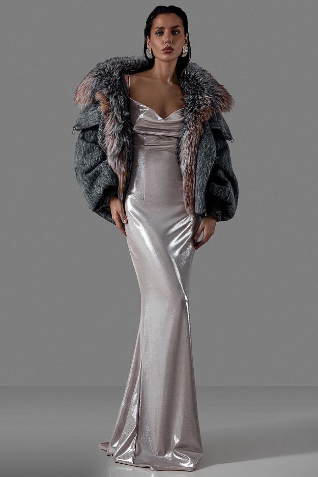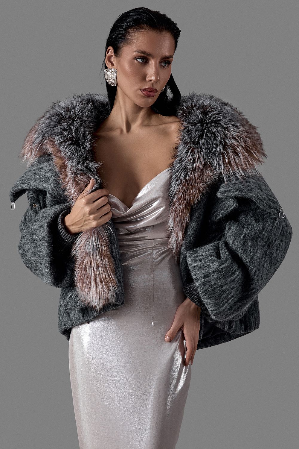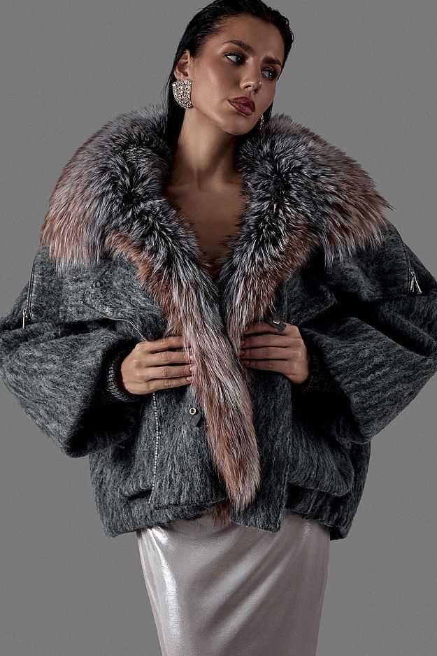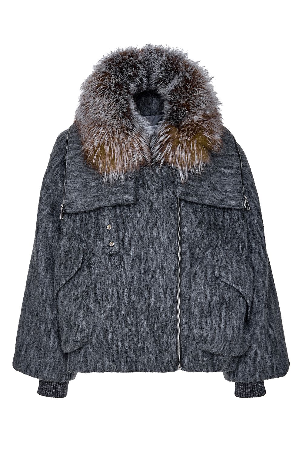 Акцентный бомбер свободного кроя выполнен из плотной фактурной ткани. Широкий воротник и борт дополнены контрастной отделкой из натурального меха, которая придаёт образу выразительность и визуальную глубину. Застежка на молнию добавляет функциональности.Состав: Верх: 90% полиэстер,10% натуральный шелк; подкладка: 100% нейлон; наполнитель: 90% гусиный пух