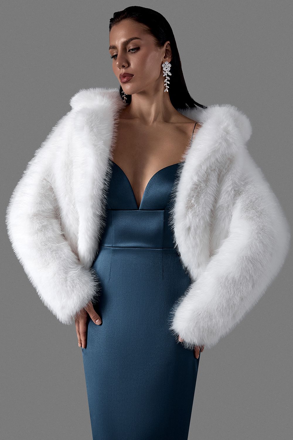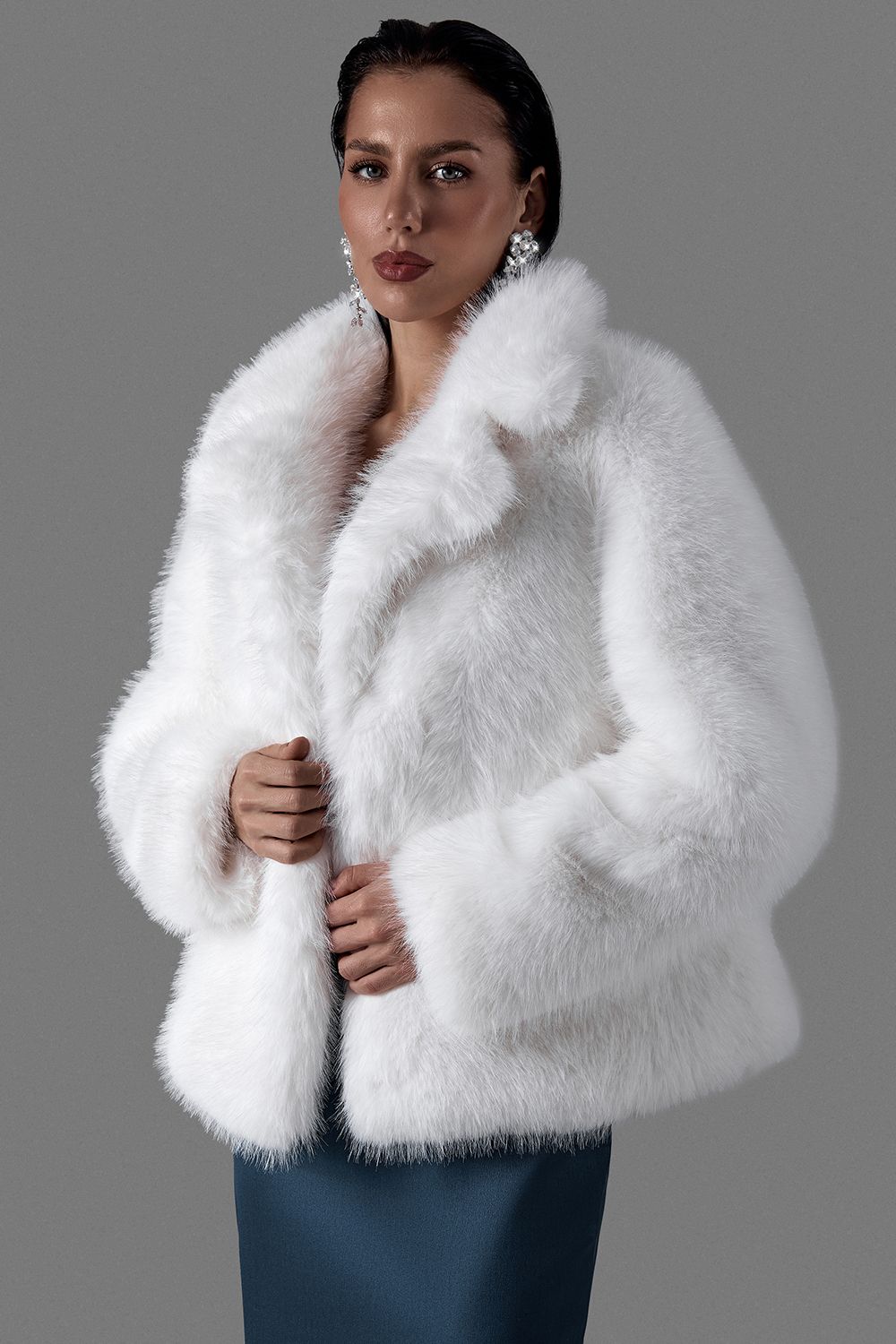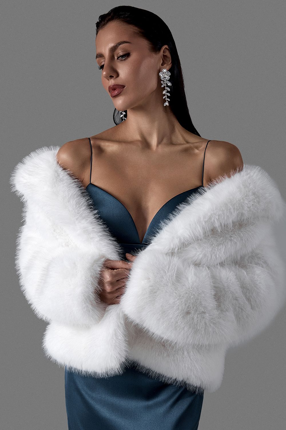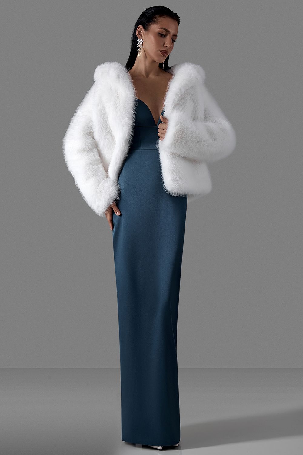 Белая короткая шуба из мягкого экомеха с выразительной фактурой. Модель выполнена в холодном серо-белом оттенке с естественными переходами, создающими визуальный объем и глубину. Свободный силуэт и спущенная линия плеч формируют расслабленную, но статусную посадку. Состав: 100% Полиэстер