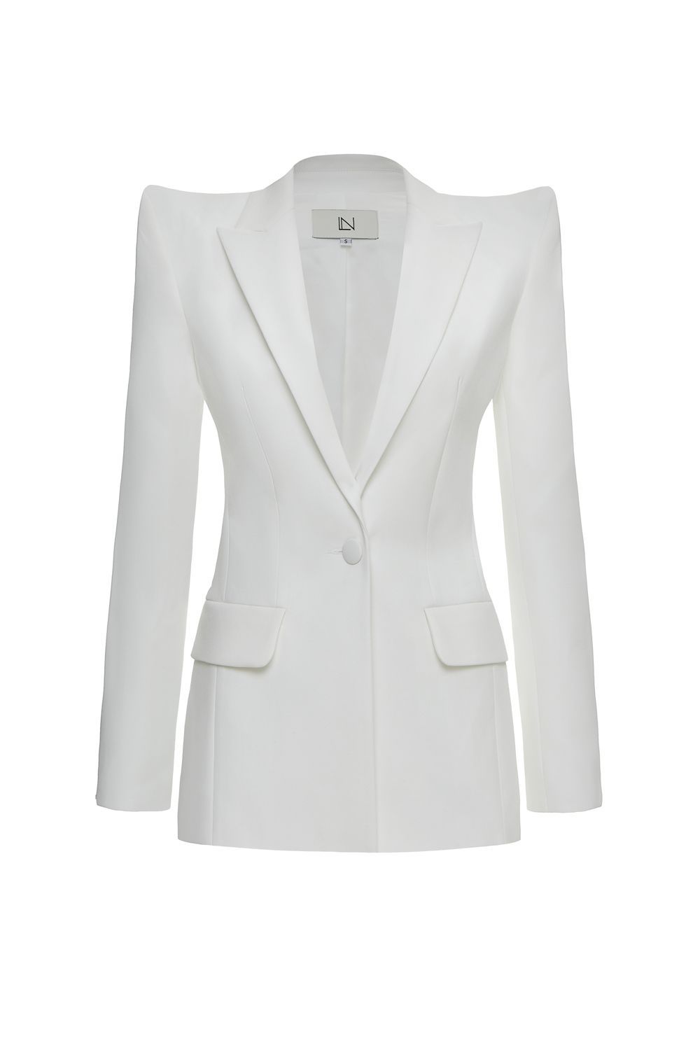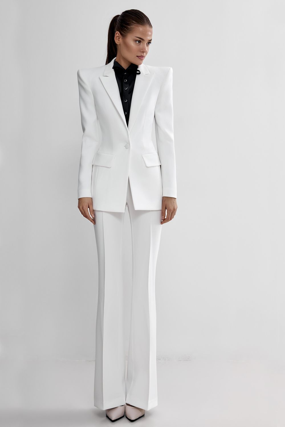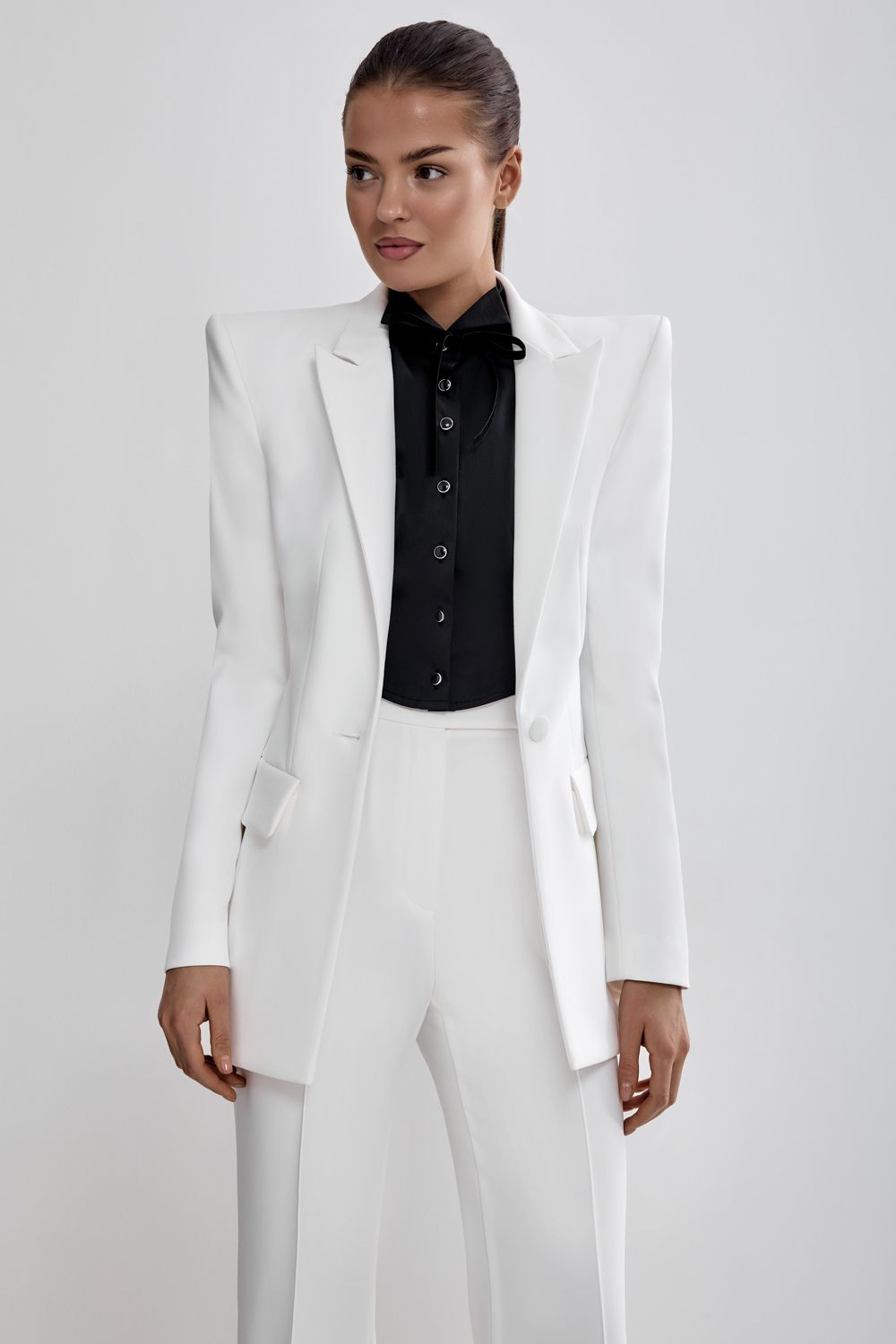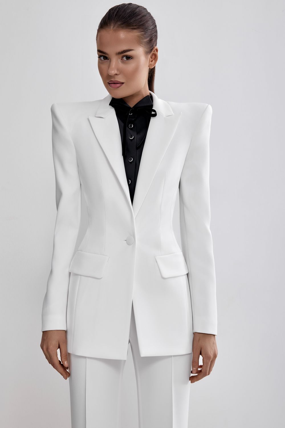 Однобортный жакет приталенного силуэта, имеет увеличенную линию плеча и плечевые накладки. Длина по спинке: 69 см. Состав: 71% полиэстер, 23% вискоза, 6% эластан. Подкладка: 95% полиэстер 5% эластан.