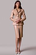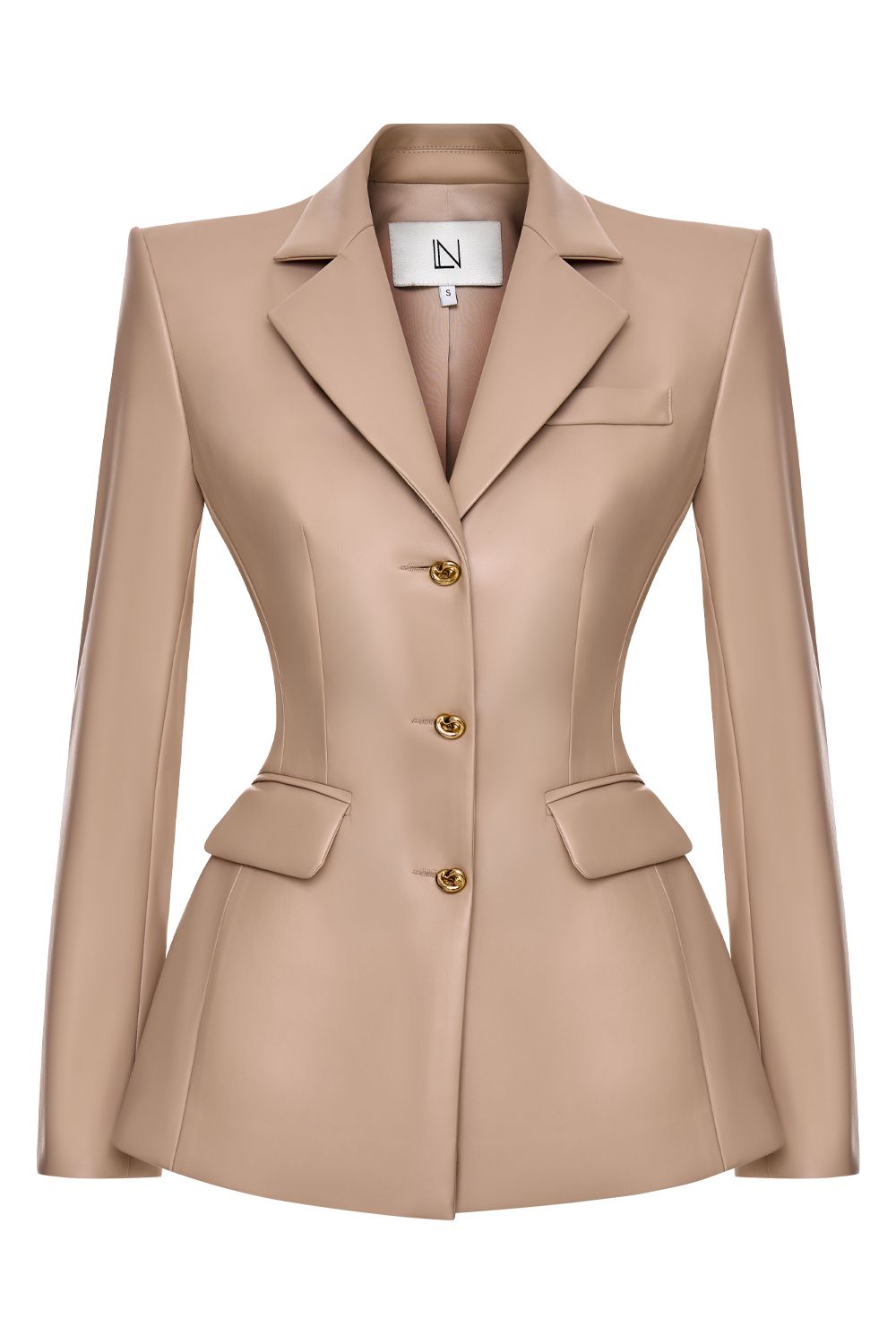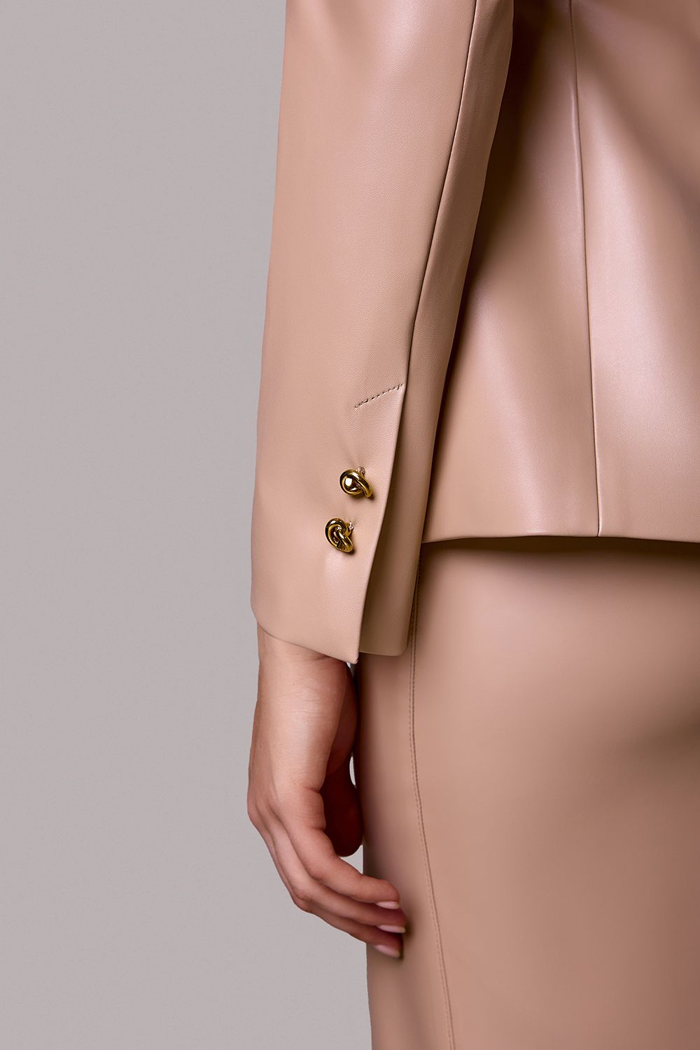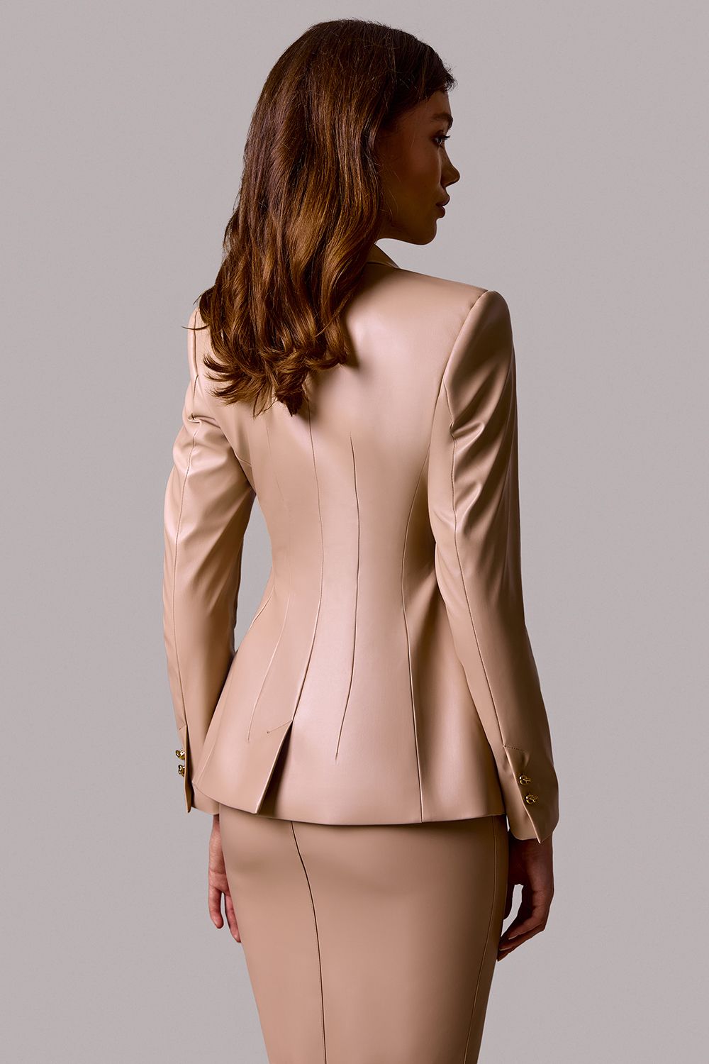 Приталенный жакет из экокожи — выразительный элемент гардероба с архитектурным силуэтом. Чёткая линия плеч и зауженная талия формируют графичную посадку, подчеркивая фигуру. Гладкая фактура материала добавляет образу глубину и современный характер. Острые лацканы и лаконичная застёжка усиливают строгость и элегантность модели. Идеален в комплекте с юбкой или брюками, создавая цельный и эффектный образ. Состав: 100% полиэстер, подкладка 95% полиэстер, 5% эластан