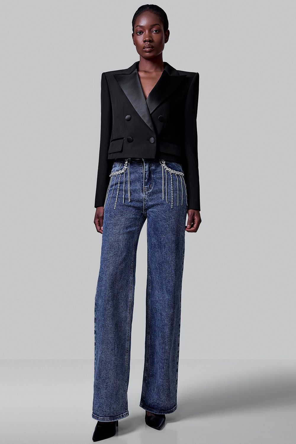 Укороченный жакет из плотного костюмного материала с матовым блеском. Модель с акцентными широкими лацканами и чёткой линией плеч. Двубортная застёжка на обтянутые пуговицы придаёт изделию утончённую завершённость. Лаконичные клапаны карманов и аккуратный декоративный кантик вдоль борта добавляют образу архитектурности. Состав: 71% полиэстер, 23% вискоза, 6% эластан, Подклад 97% полиэстер 3% эластан
