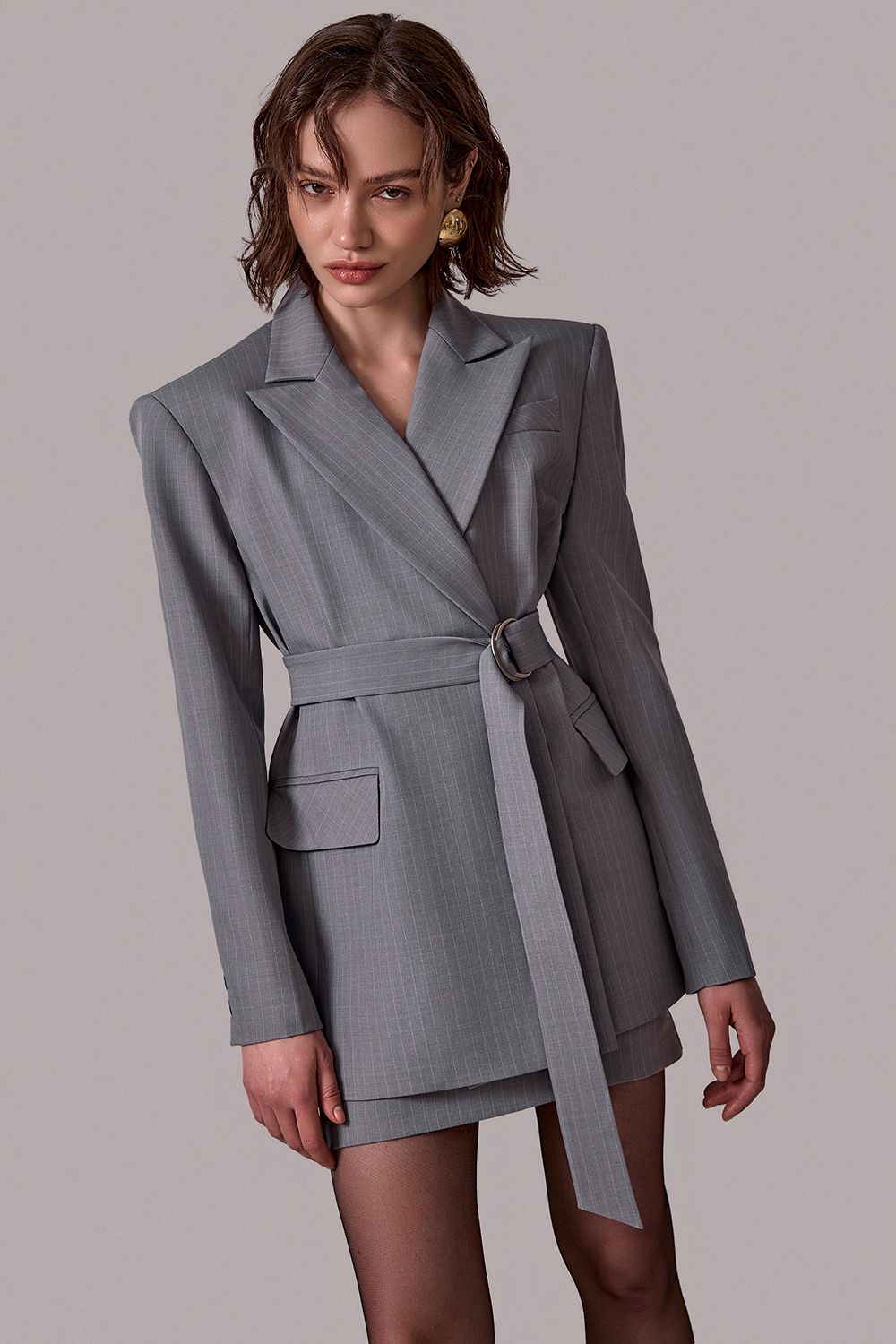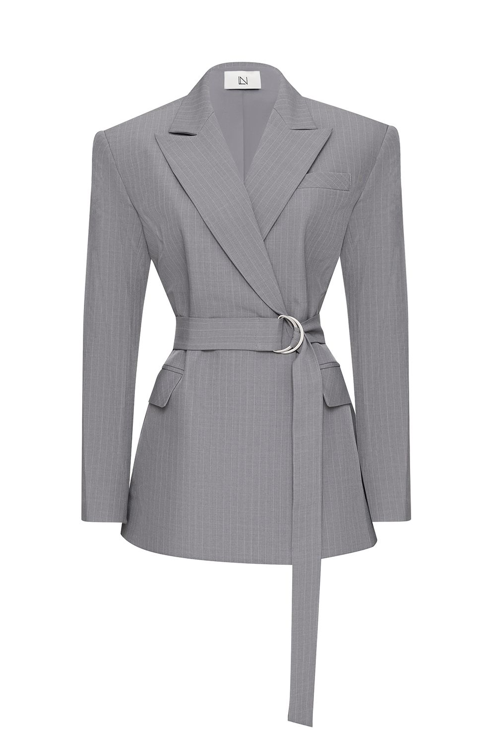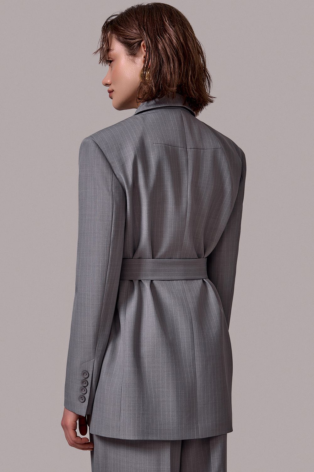 Элегантный двубортный жакет прямого кроя с акцентной линией плеч и поясом на металлической пряжке. Выполнен из костюмной ткани с тонкой вертикальной полоской, визуально вытягивающей силуэт. Лацканы классической формы, накладные карманы с клапанами и нагрудный карман добавляют образу строгости и стиля. Состав: 65% полиэстер, 30% вискоза, 5% спандекс ; подкладка: 95% полиэстер, 5% эластан