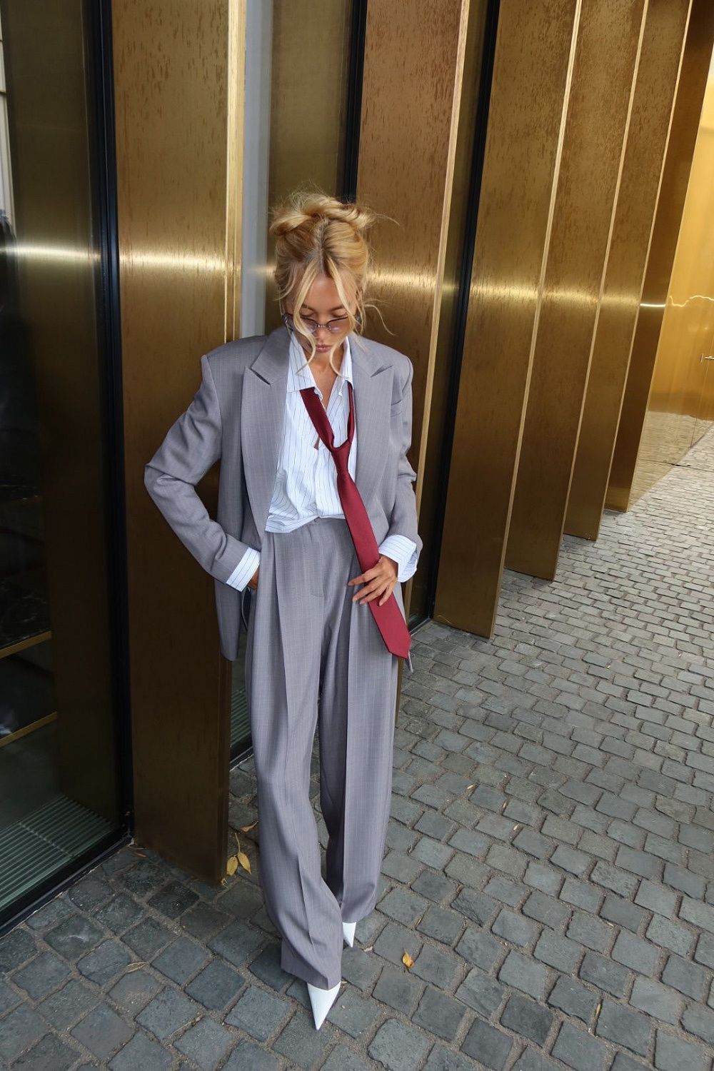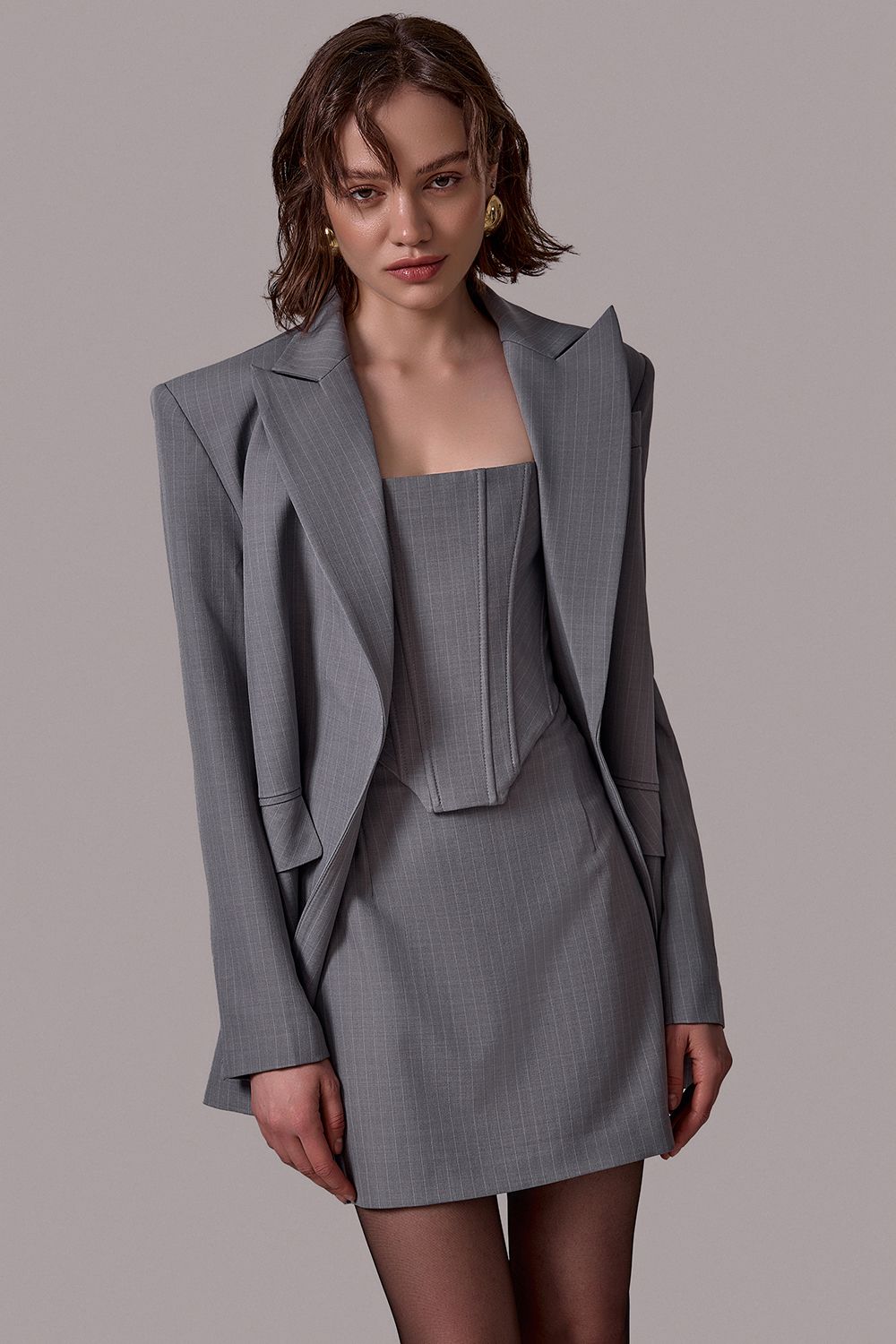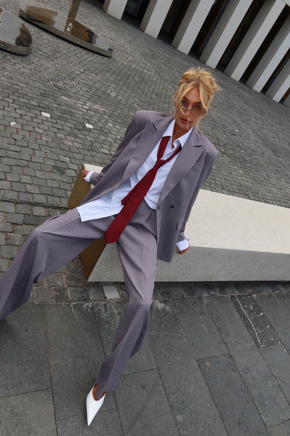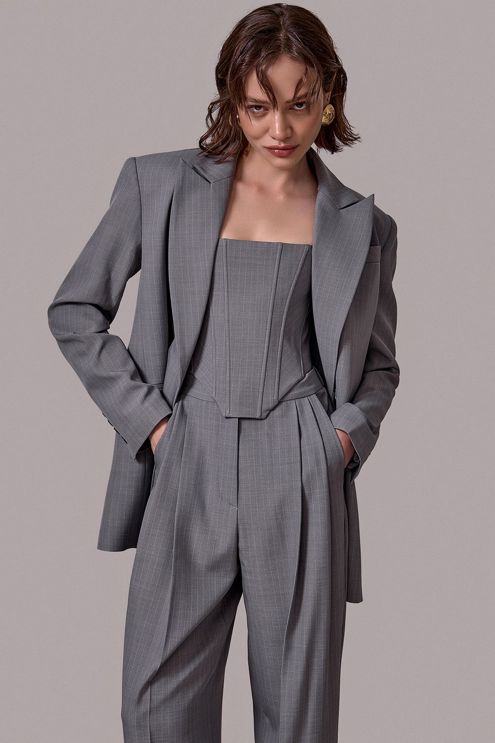 Элегантный двубортный жакет прямого кроя с акцентной линией плеч и поясом на металлической пряжке. Выполнен из костюмной ткани с тонкой вертикальной полоской, визуально вытягивающей силуэт. Лацканы классической формы, накладные карманы с клапанами и нагрудный карман добавляют образу строгости и стиля. Состав: 65% полиэстер, 30% вискоза, 5% спандекс ; подкладка: 95% полиэстер, 5% эластан