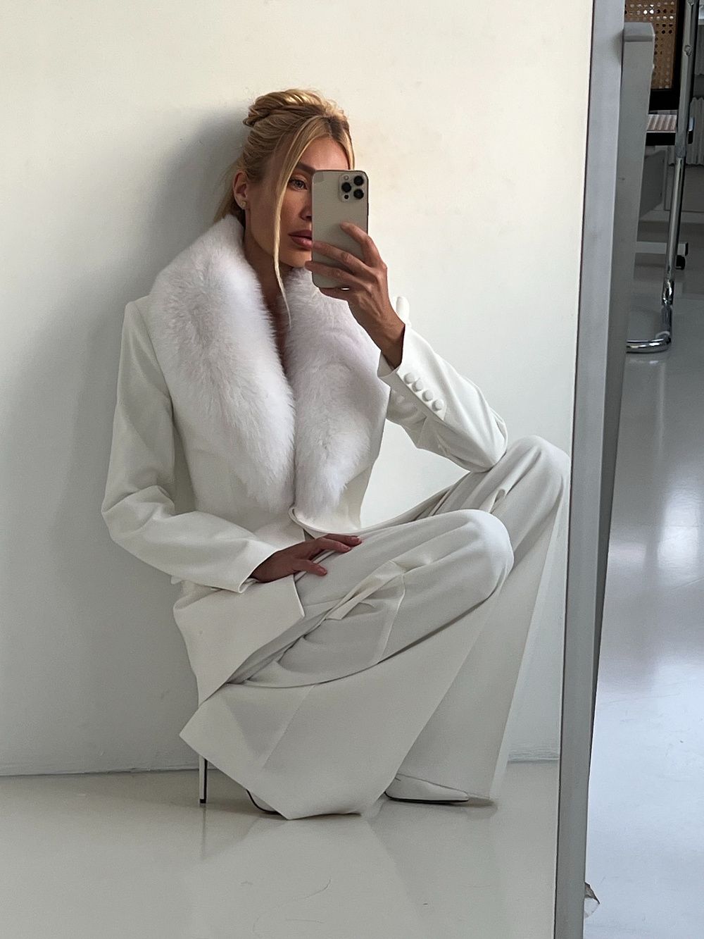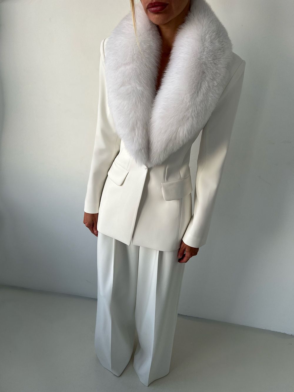 Элегантный жакет прямого силуэта, выполненный из плотной костюмной ткани с безупречной посадкой. Акцентом модели выступает объёмный съёмный воротник из натурального меха песца, который придаёт образу выразительность и ощущение роскоши. Состав: 63% вискоза, 32% полиэстер, 5% эластан, Подкладка 95% полиэстер, 5% эластан