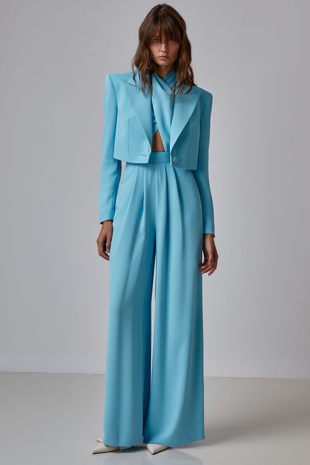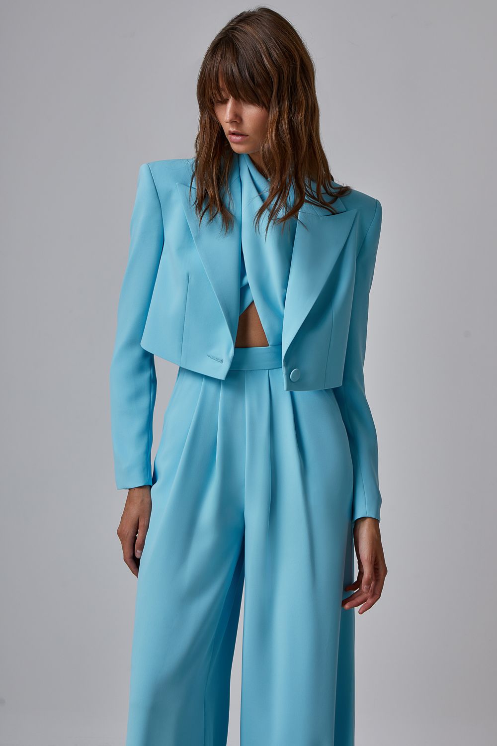 Укороченный жакет с объемными плечами, застегивается на одну пуговицу спереди. Состав: 62% полиэстер, 38% вискоза. Подкладка: 95% полиэстер, 5% эластан.
