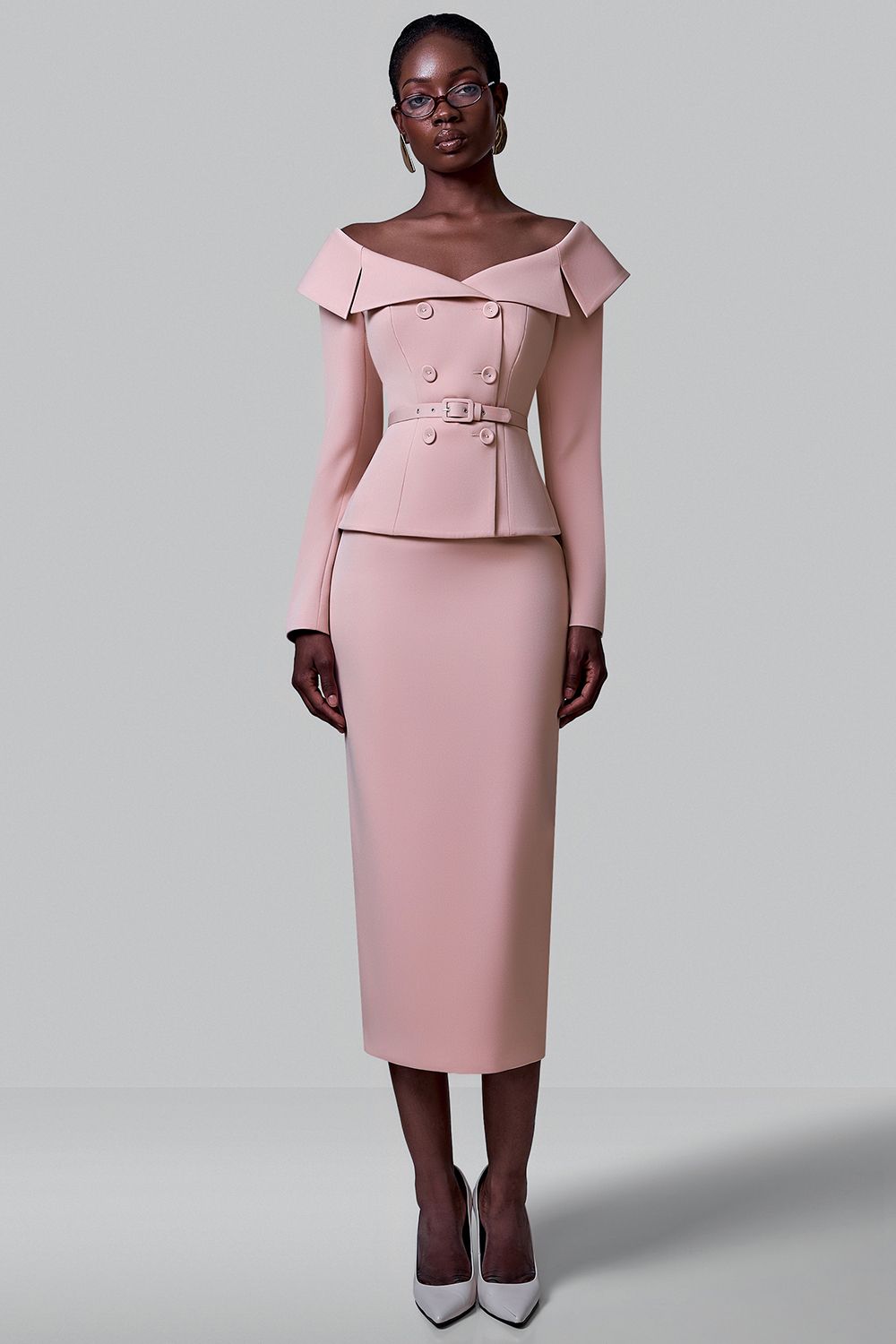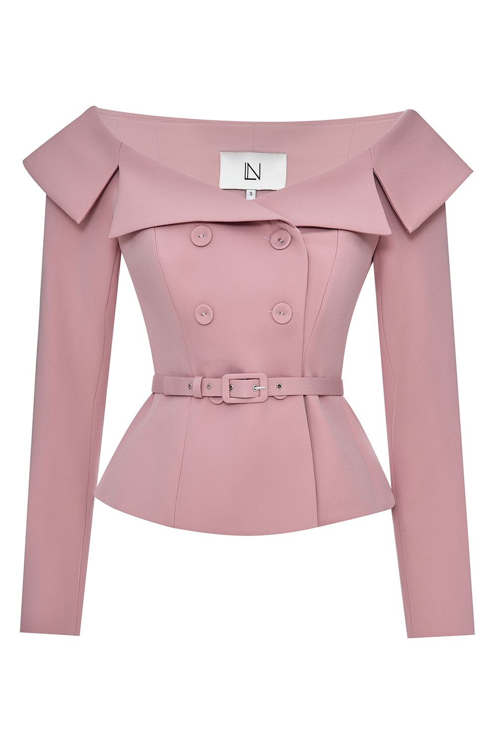 Жакет выполнен из плотной костюмной ткани. Модель отличается элегантным дизайном с открытыми плечами и широким отложным воротником, который придаёт образу утончённость. Двубортная застёжка декорирована крупными пуговицами в тон изделия. Талия подчеркнута съемным ремнём с пряжкой, создающим изящный силуэт «песочные часы». Длинные рукава и аккуратная посадка по фигуре делают жакет универсальным вариантом для вечерних выходов. Состав: 60% полиэстер, 35% вискоза, 5% эластан, Подкладка 95% полиэстер, 5% эластан